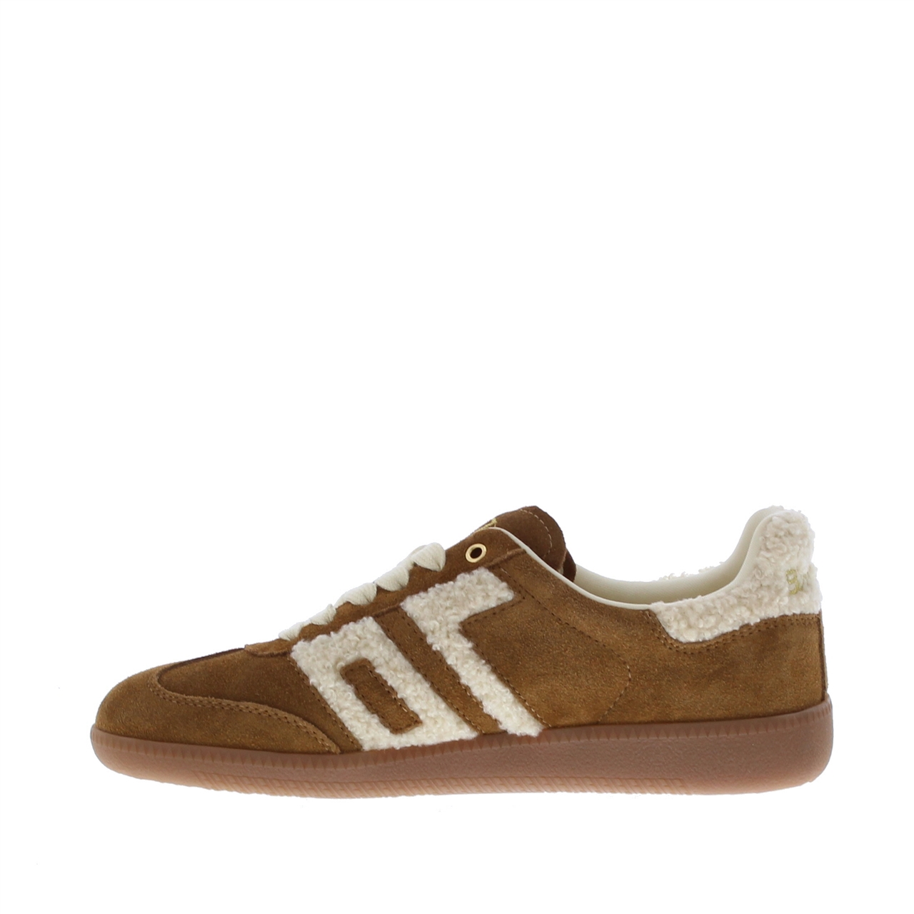 Deze uitvoering in cognac valt op door de buitenkant in verschillende materialen, wat de schoen een gelaagd en karaktervol effect geeft. De ronde leest houdt het silhouet zacht en vrouwelijk, terwijl de rubberen zool zorgt voor een stabiele, dagelijkse basis.