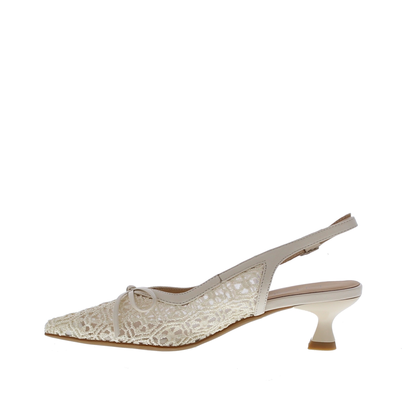 De buitenkant is uitgevoerd in mesh, wat het model een verfijnd, open karakter geeft. De spitse leest zorgt voor een gestroomlijnde uitstraling, terwijl het kleine hakje de schoen mooi vrouwelijk houdt zonder zwaar te ogen.