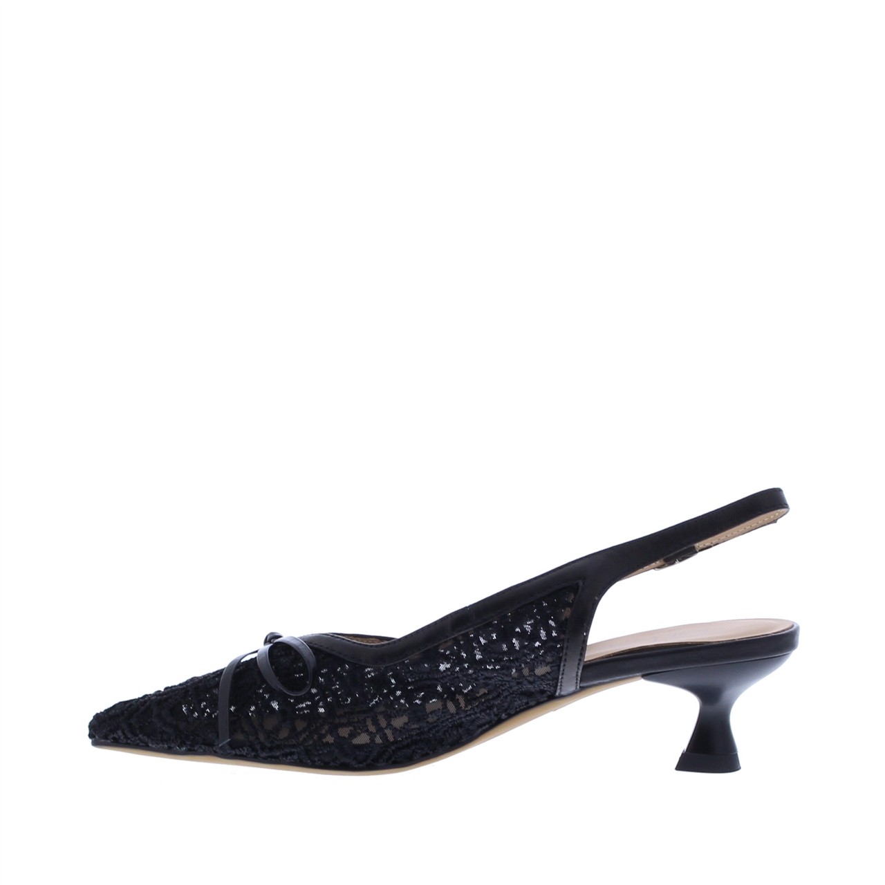 De buitenkant is uitgevoerd in mesh, wat het model een verfijnd, open karakter geeft. De spitse leest zorgt voor een gestroomlijnde uitstraling, terwijl het kleine hakje de schoen mooi vrouwelijk houdt zonder zwaar te ogen.