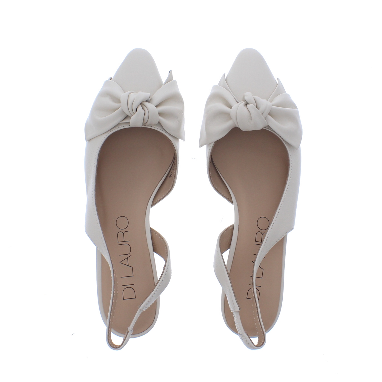 Het model van Di Lauro combineert een spitse leest met een vrouwelijke strik op de wreef, waardoor de lijn van de schoen extra chic oogt. De slingback wordt op zijn plek gehouden met een elastiek, zodat je de schoen gemakkelijk aantrekt en hij mooi aansluit rond de hiel.