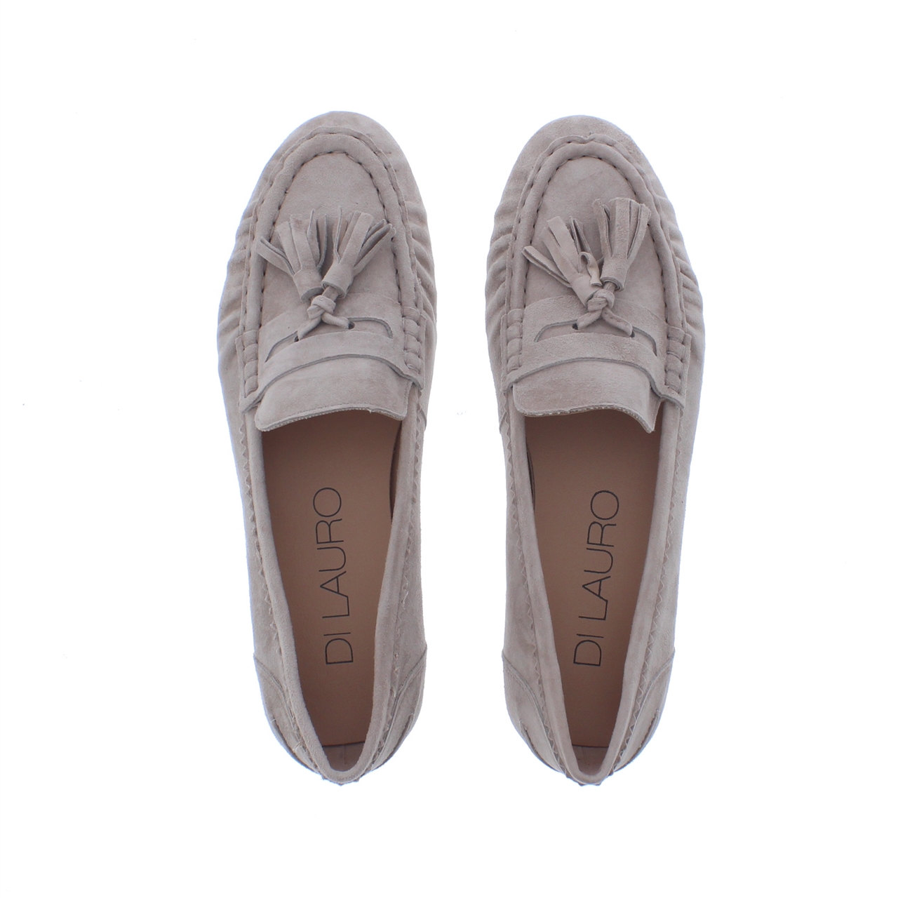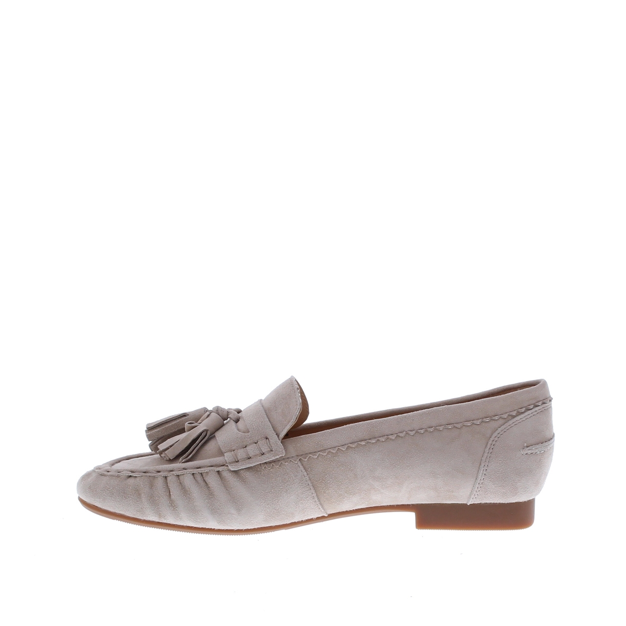 Het buitenwerk is uitgevoerd in suède, wat de kleur een zachte, matte uitstraling geeft. De ronde leest en de instapvorm houden het silhouet klassiek en makkelijk te combineren, terwijl de plooi op de wreef en de subtiele kwastjes zorgen voor een nette, vrouwelijke touch.