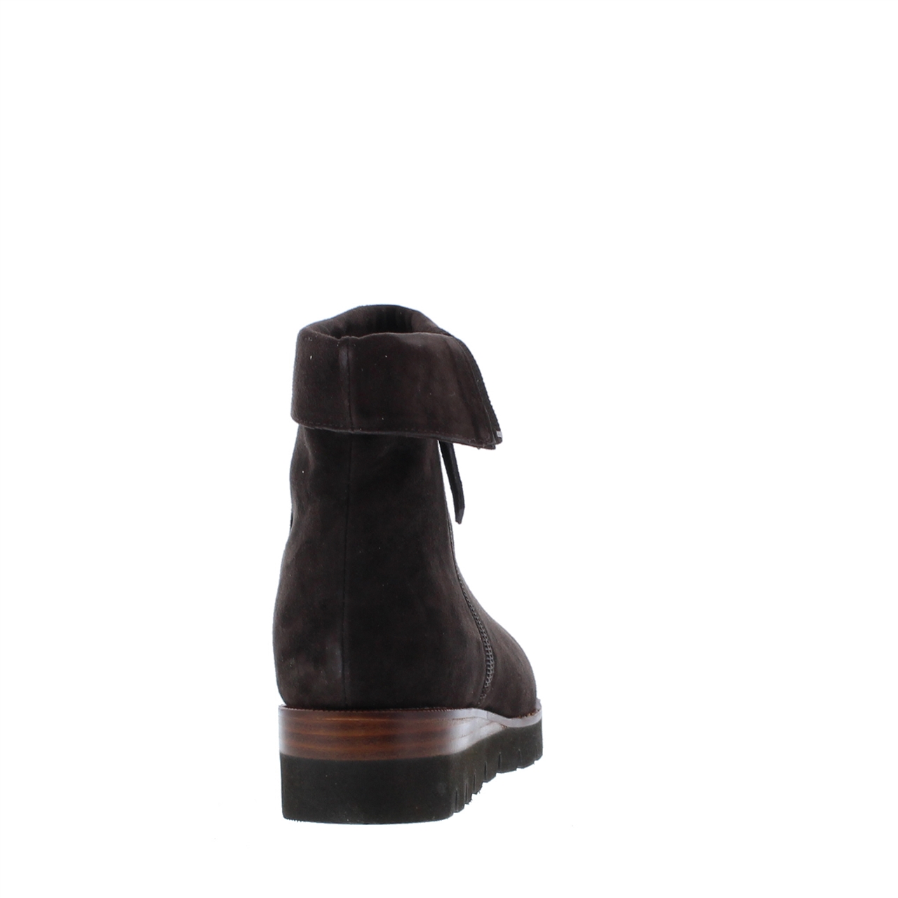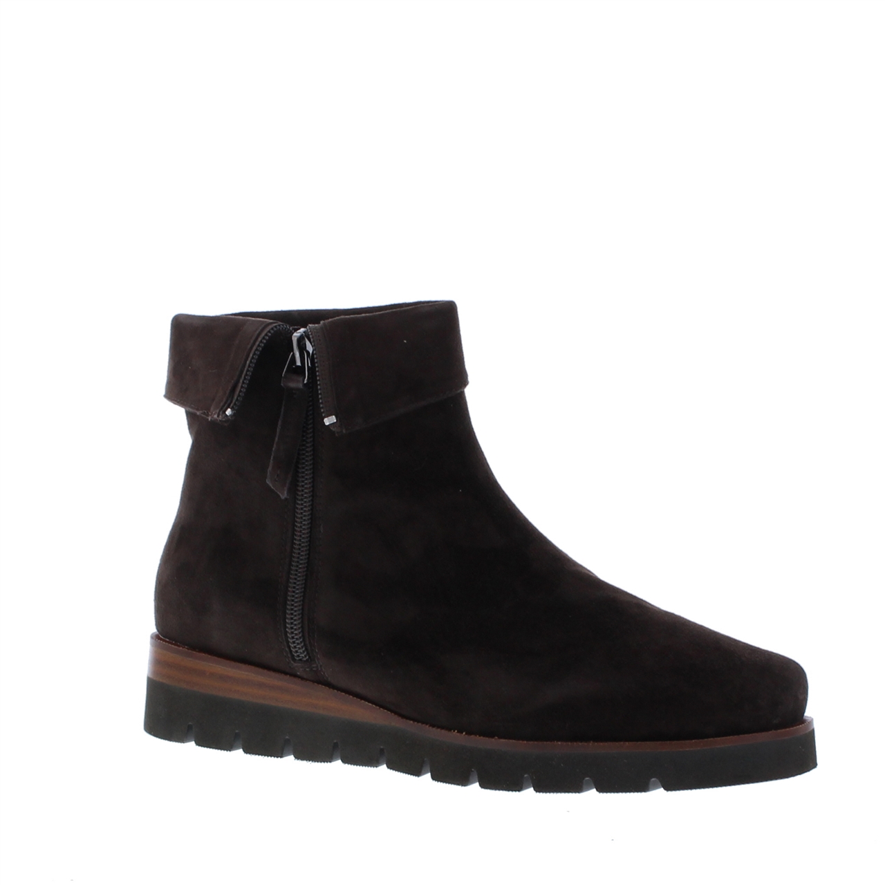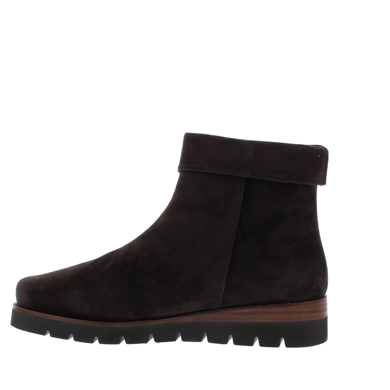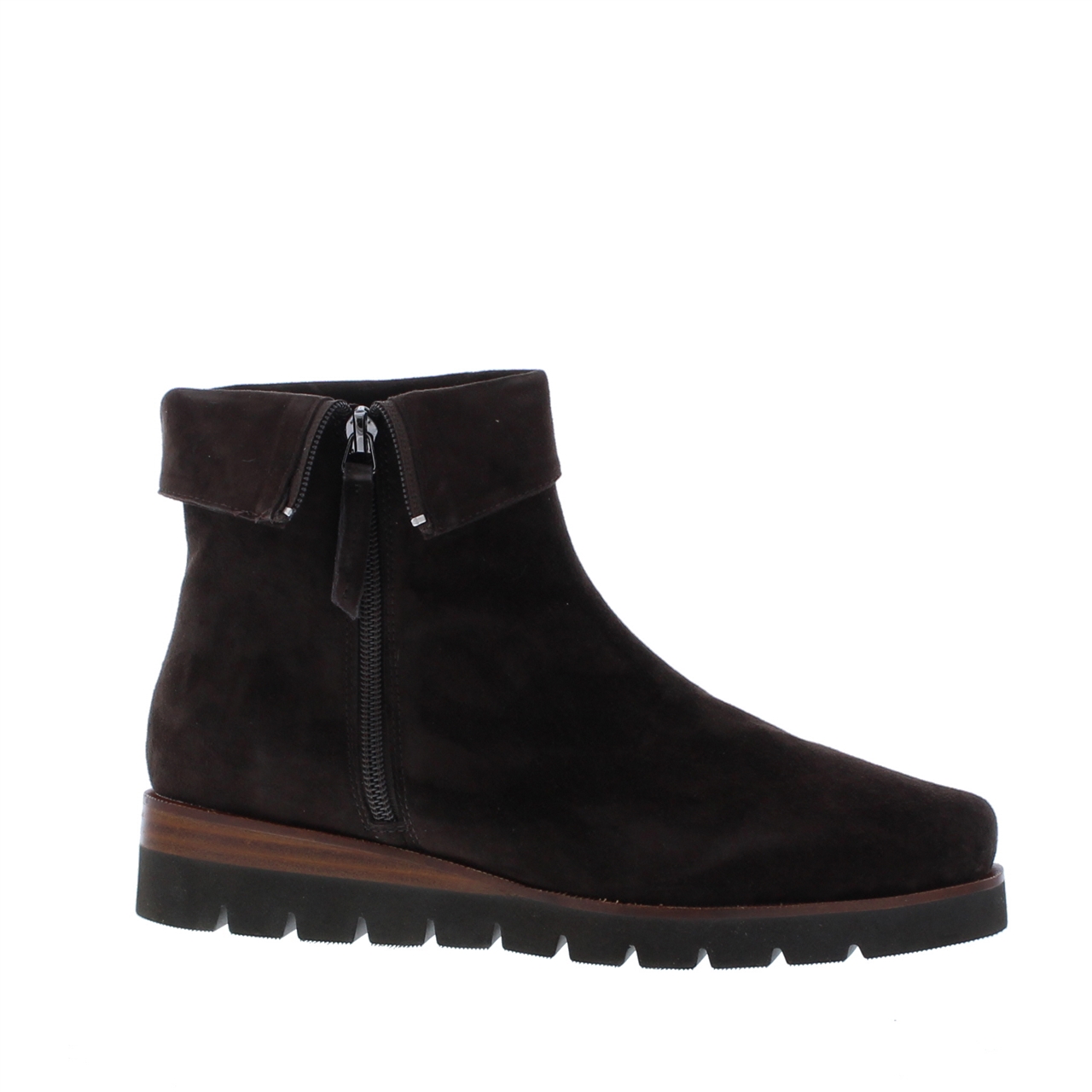 Het buitenwerk is uitgevoerd in suède, wat de laars een zachte, luxe uitstraling geeft. Binnenin is gekozen voor leer, waardoor het geheel mooi en verzorgd aanvoelt. De ronde leest en de enkelhoge schacht zorgen voor een prettige, toegankelijke look die zowel casual als net gedragen kan worden.