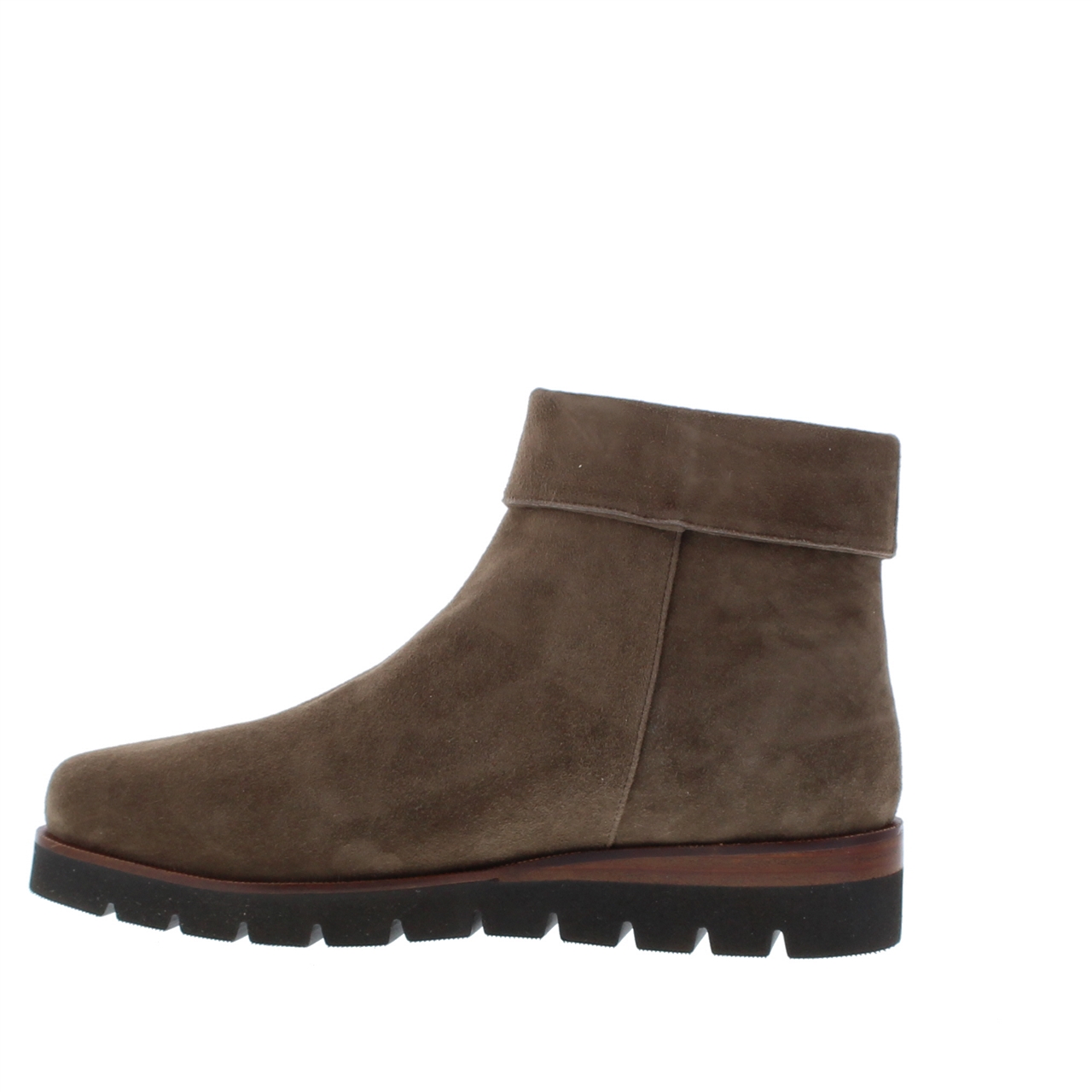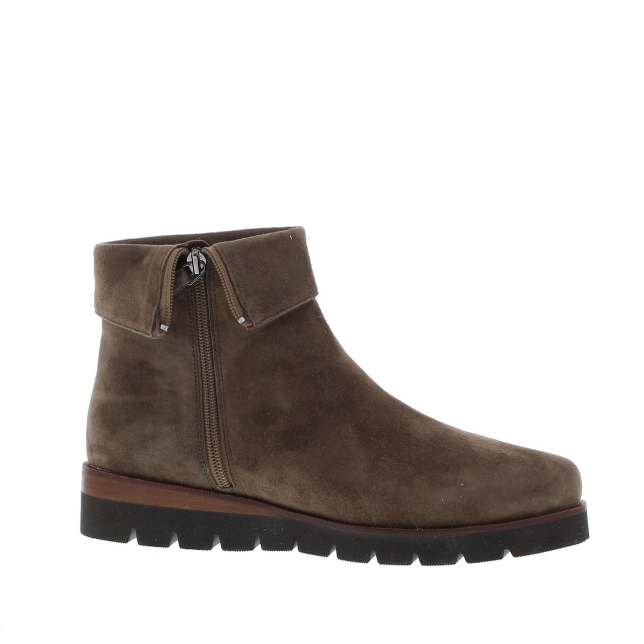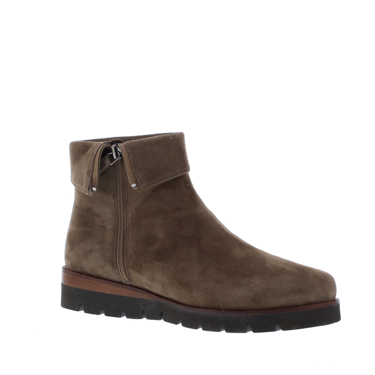 Het buitenwerk is uitgevoerd in suède, wat de laars een zachte, luxe uitstraling geeft. Binnenin is gekozen voor leer, waardoor het geheel mooi en verzorgd aanvoelt. De ronde leest en de enkelhoge schacht zorgen voor een prettige, toegankelijke look die zowel casual als net gedragen kan worden.