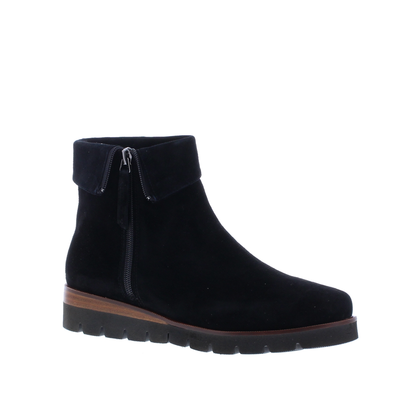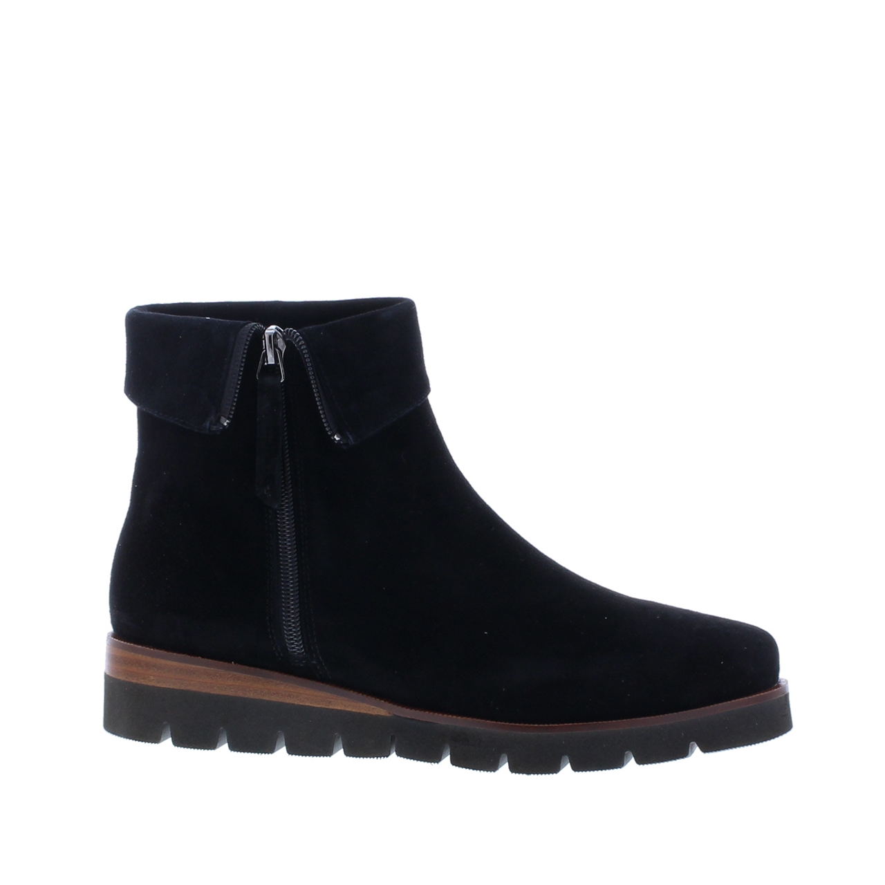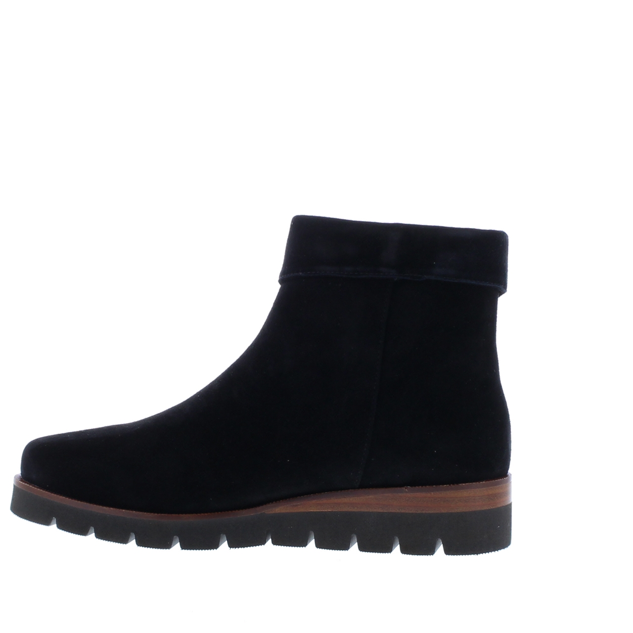 Het buitenwerk is uitgevoerd in suède, wat de laars een zachte, luxe uitstraling geeft. Binnenin is gekozen voor leer, waardoor het geheel mooi en verzorgd aanvoelt. De ronde leest en de enkelhoge schacht zorgen voor een prettige, toegankelijke look die zowel casual als net gedragen kan worden.