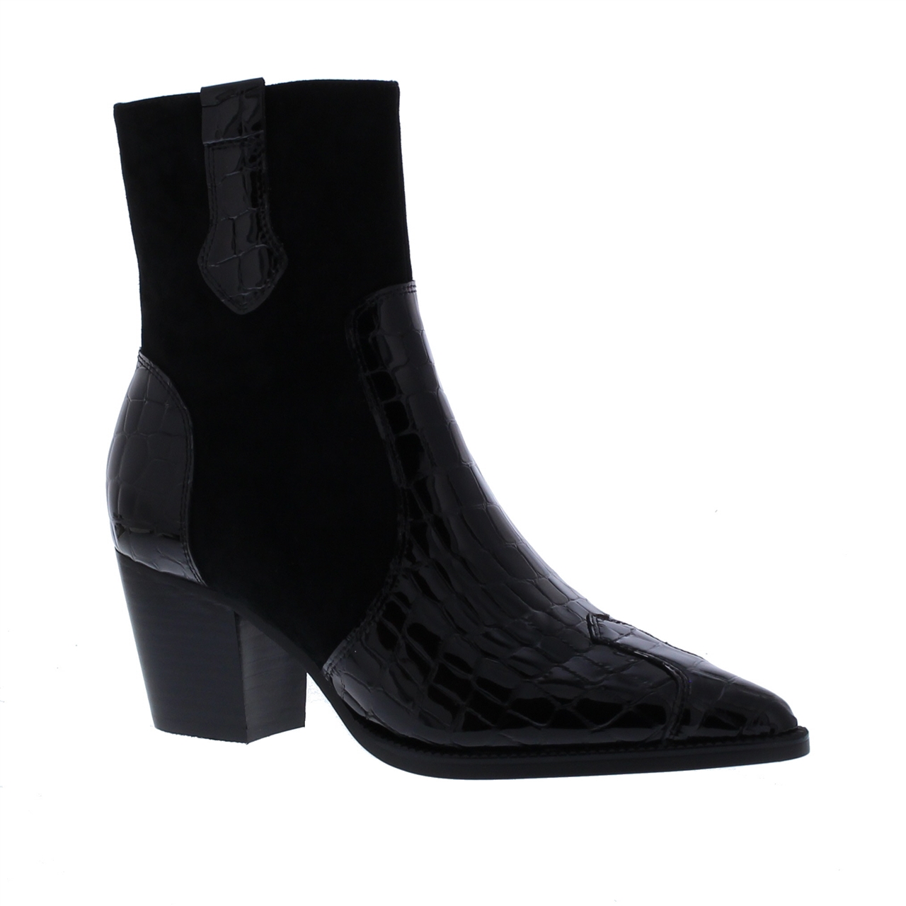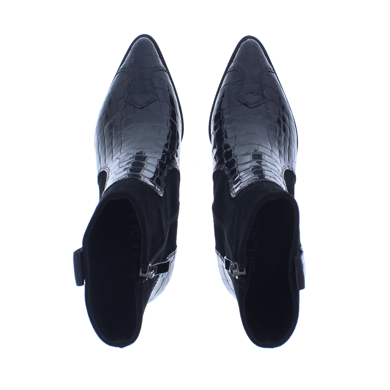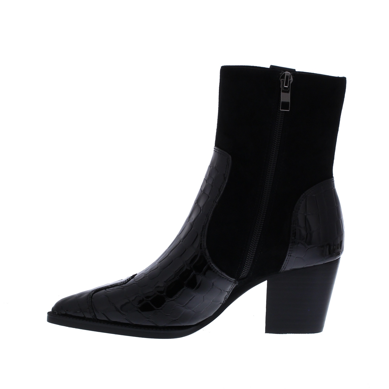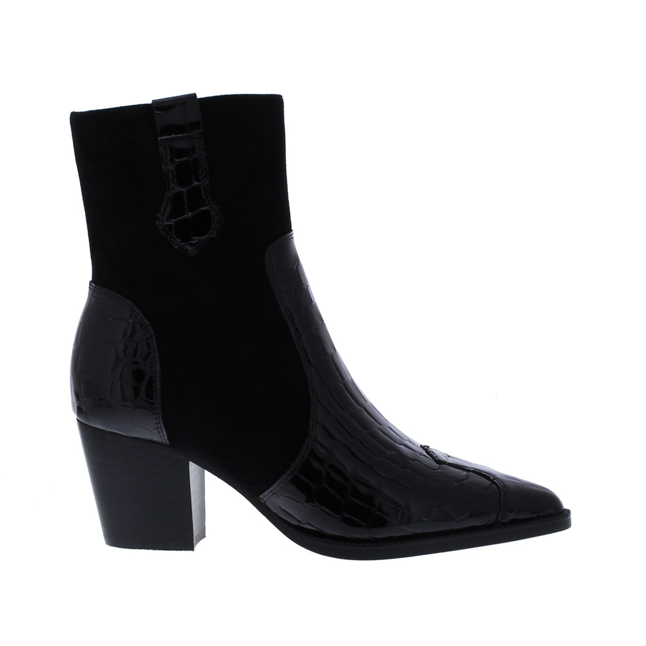 Maak een fashion statement met deze enkellaars van Di Lauro. Deze zwarte laars met lak crocoprint details straalt stijl en klasse uit. Dit model is gemaakt van een combinatie van suède en croco lakleer aan de buitenkant en gevoerd met hoogwaardig leer. Binnenin is de combinatie van materialen comfortabel en duurzaam. De spits toelopende leest voegt elegantie toe, terwijl de ritssluiting zorgt voor gemak bij het aan- uittrekken. Met een schachthoogte van 18 cm en een hakhoogte van 6 cm, is deze enkellaars perfect om te dragen bij elke gelegenheid.