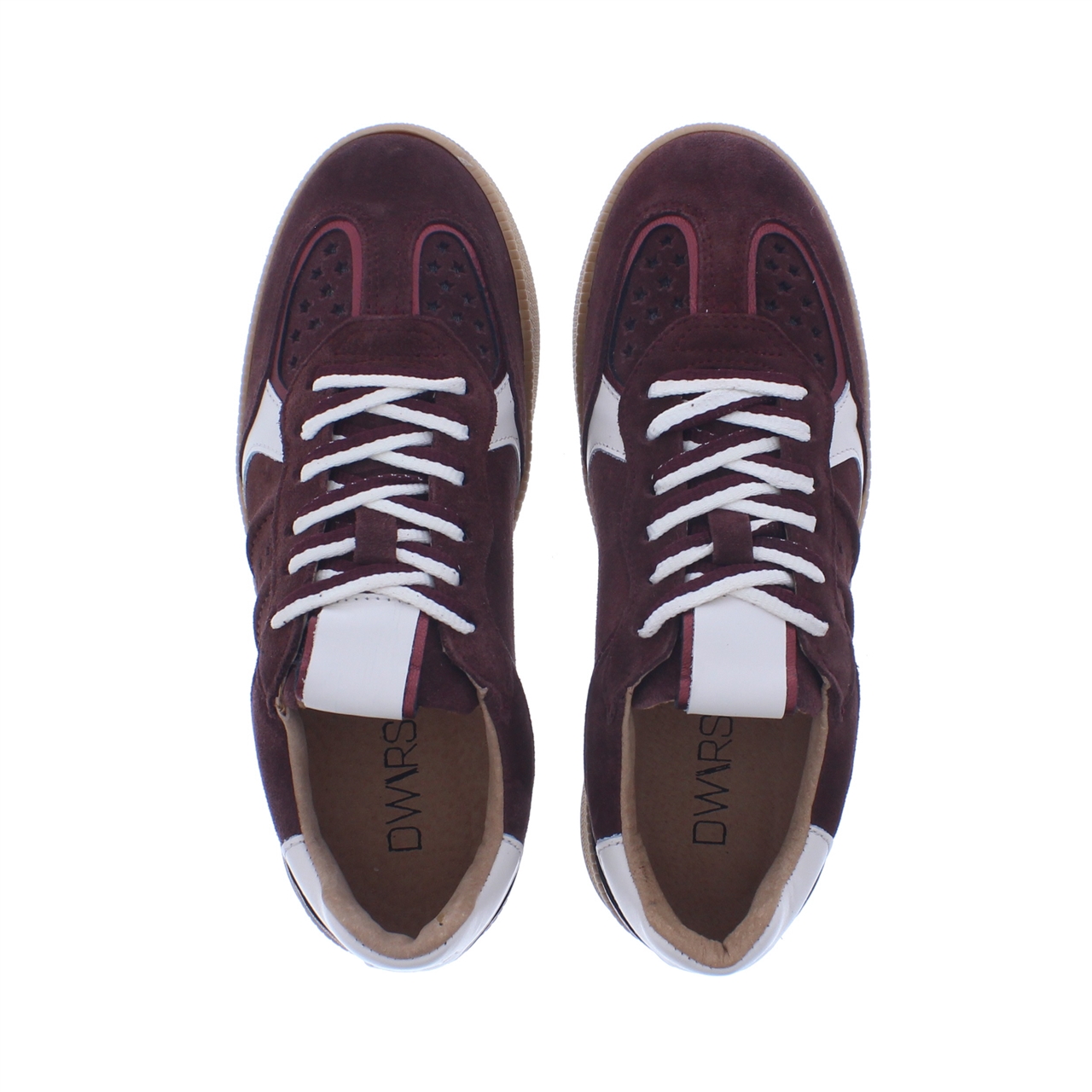 De DWRS Mirabel Sneaker Bordeaux/Off White is de perfecte combinatie van retro en modern. Deze sneaker, uitgevoerd in een rijke bordeauxrode tint, heeft een unieke mix van suède en leer met metallic details. De schoen is voorzien van een praktische vetersluiting, zodat je altijd de perfecte pasvorm kunt creëren. Dankzij de zachte leren binnenkant en de stevige rubberen zool geniet je de hele dag van optimaal draagcomfort. Met de DWRS Mirabel Sneaker voeg je een stijlvolle en trendy touch toe aan je outfit.