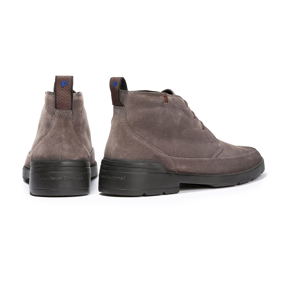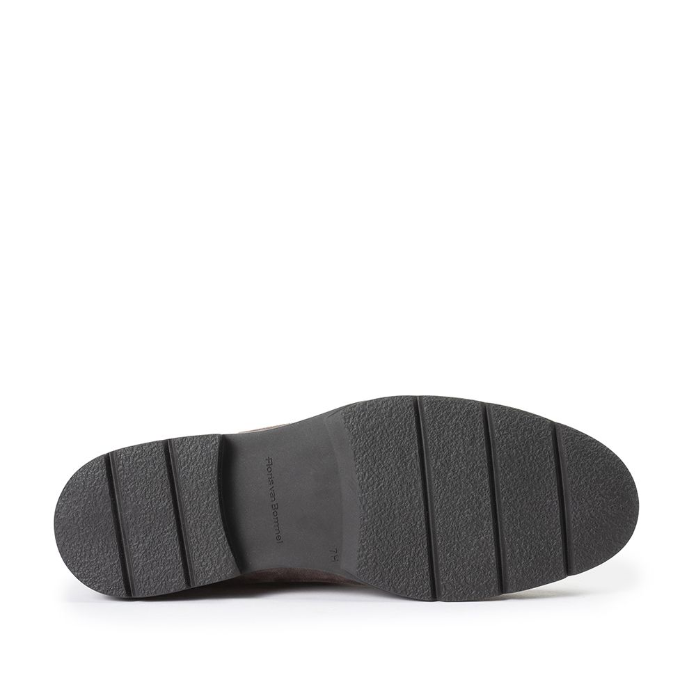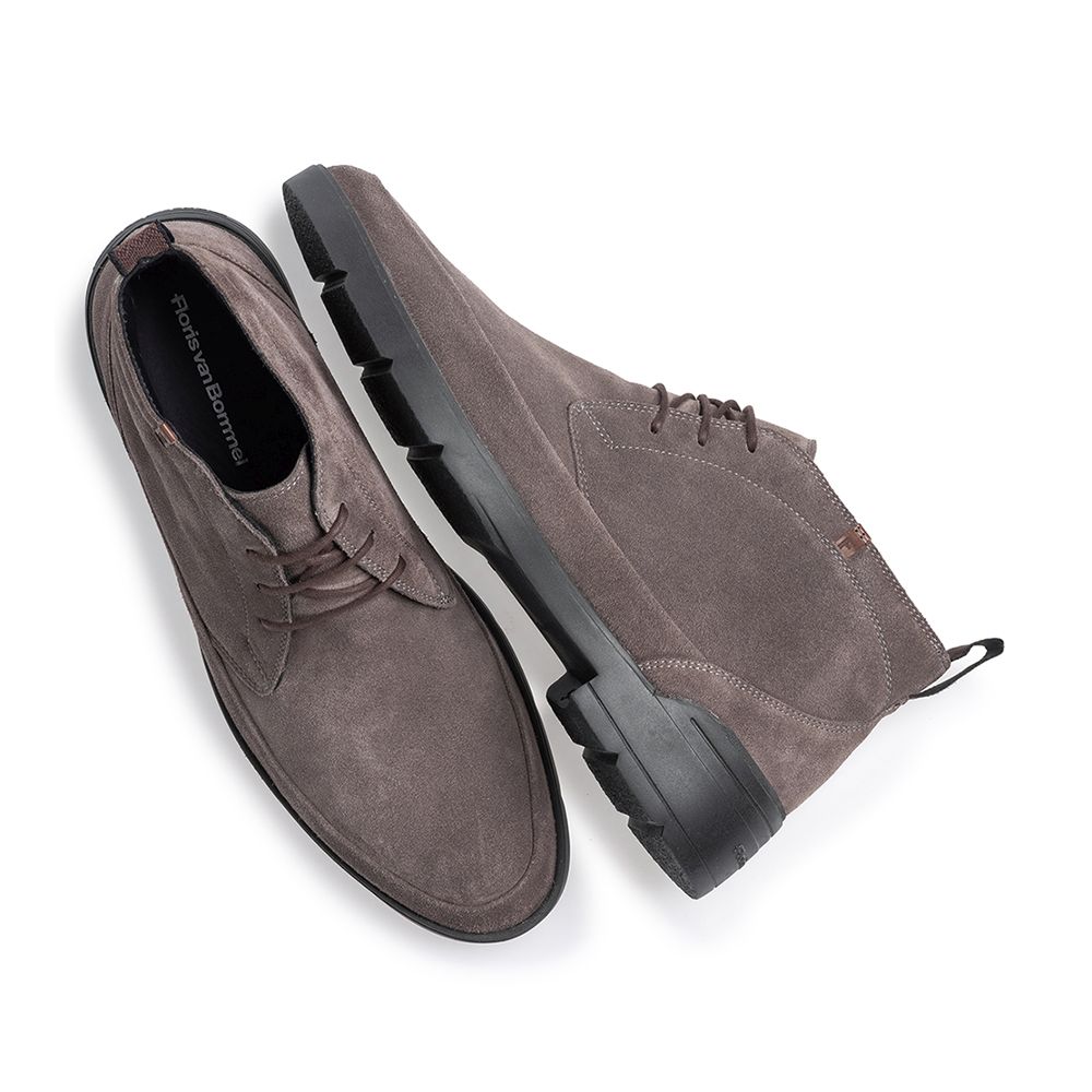 Deze boot is uitgevoerd in suède, wat het bovenwerk een zachte, matte finish geeft in zowel bruin als zwart. De enkellaars valt tot op de enkel en sluit met een vetersluiting, zodat je het silhouet mooi strak kunt aantrekken.