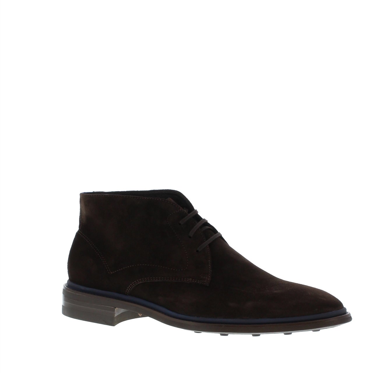 Deze casual heren veterboot van Floris van Bommel is uitgevoerd in donkerbruin suède. De veteroogjes zijn verfijnt afgewerkt en geven een sportieve uitstraling aan deze derby sluiting. De donkerblauwe rubberen welt fungeert als stootrand. Een strakke enkel hoge veterboot die zowel onder een combinatie als casual te combineren is.