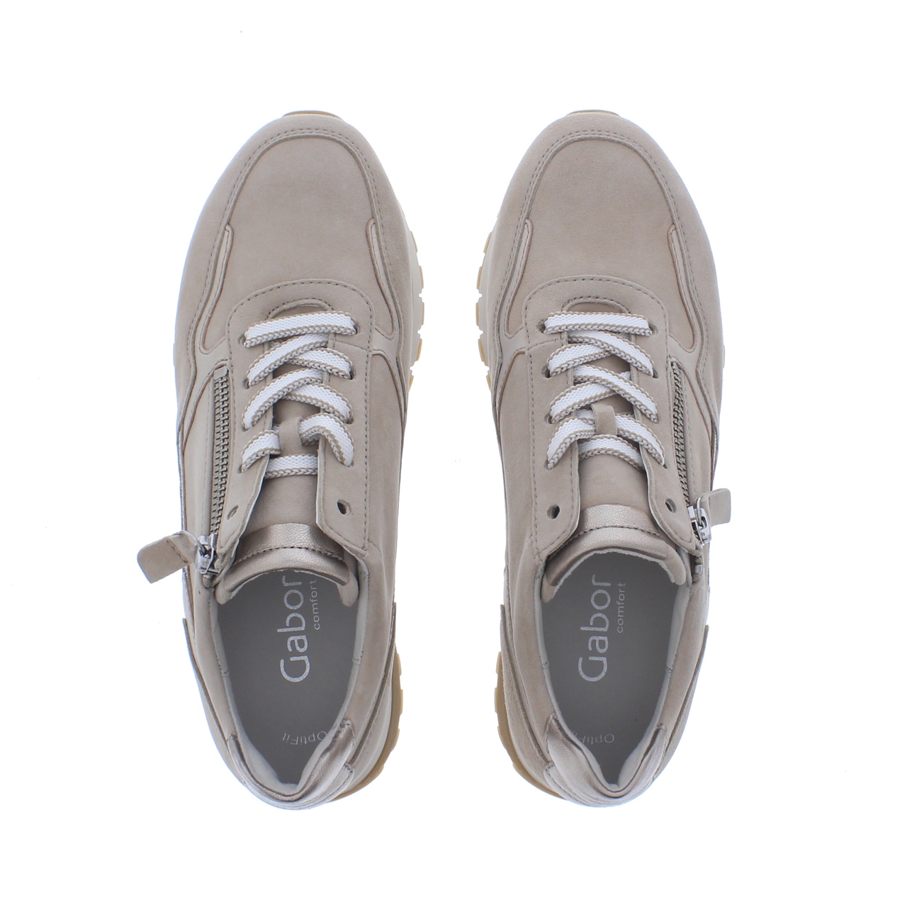 De Gabor Dames Sneaker H 33 Oak/Puder is de perfecte mix van comfort en stijl. Met een elegante taupe suède buitenkant en een zachte textiele binnenvoering, biedt deze sneaker een luxueuze uitstraling en optimaal draagcomfort. De rubberen zool zorgt voor een stevige grip, terwijl de H-leest extra ruimte biedt. Dankzij de combinatie van veters en een handige rits, trek je deze sneaker eenvoudig aan en uit. Of je nu een casual outfit draagt of een meer geklede look wilt afmaken, deze Gabor sneaker past bij elke stijl en gelegenheid.