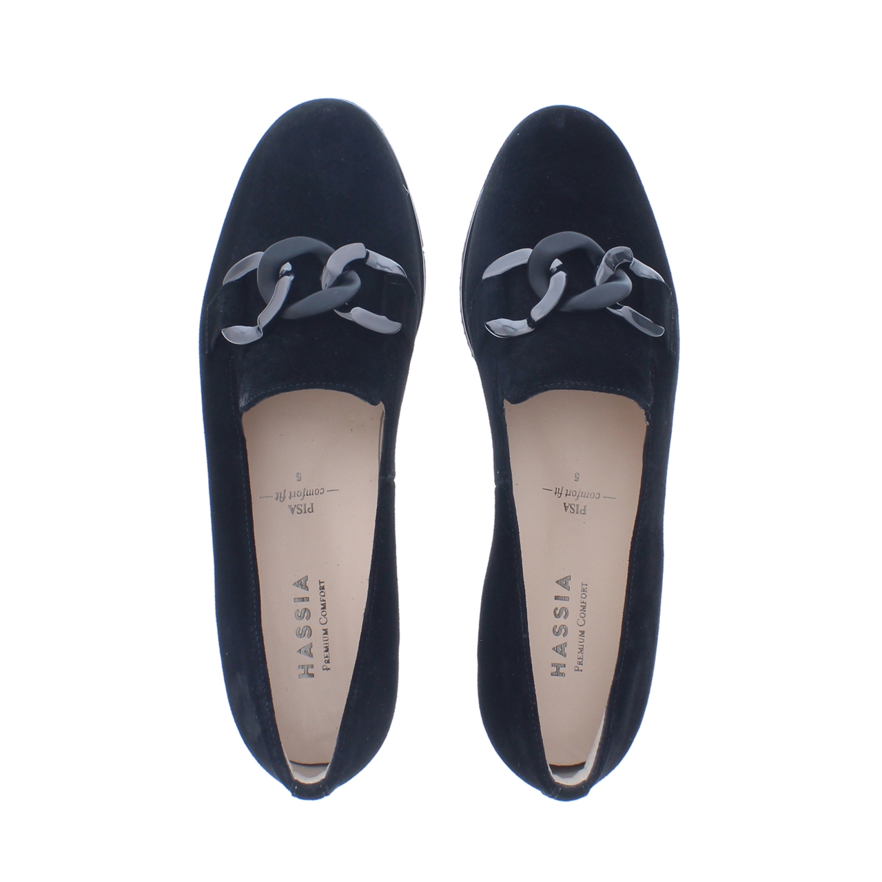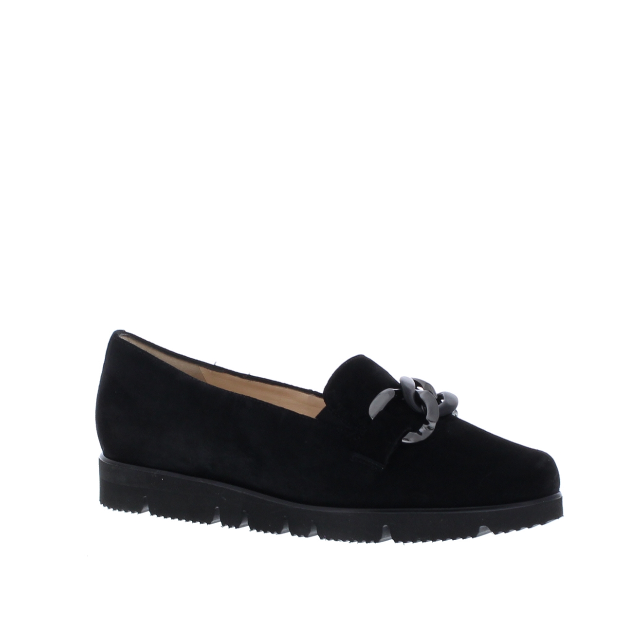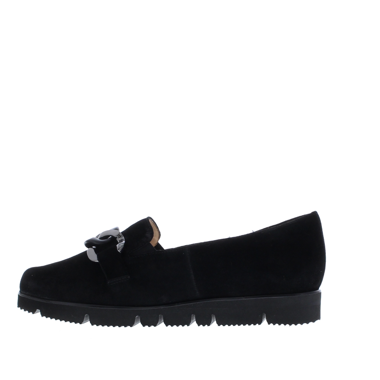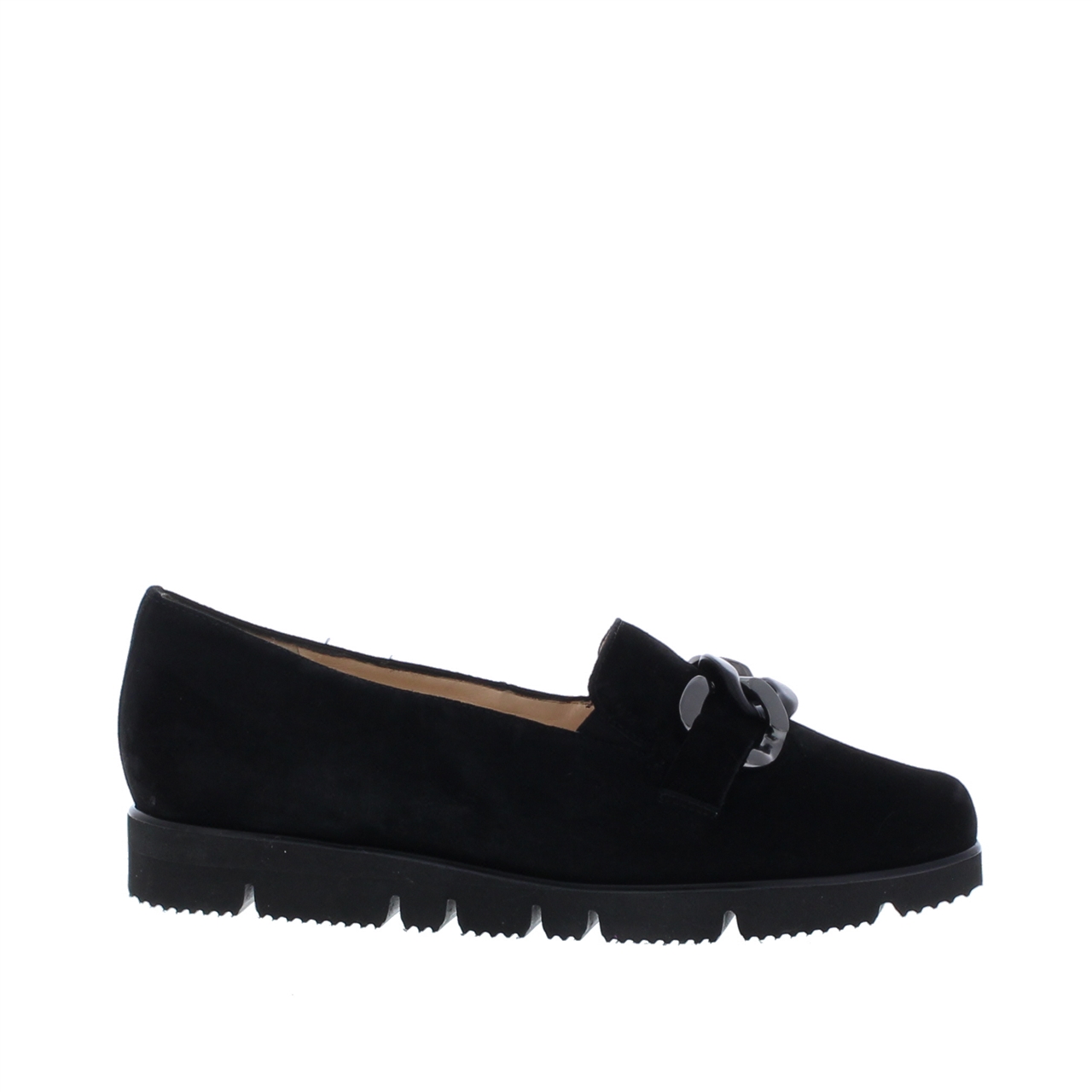 zacht suède met een klassieke schakel ketting op de wreef. De loafer is eenvoudig aan en uit te trekken. De instapper is aan de binnenzijde volledig