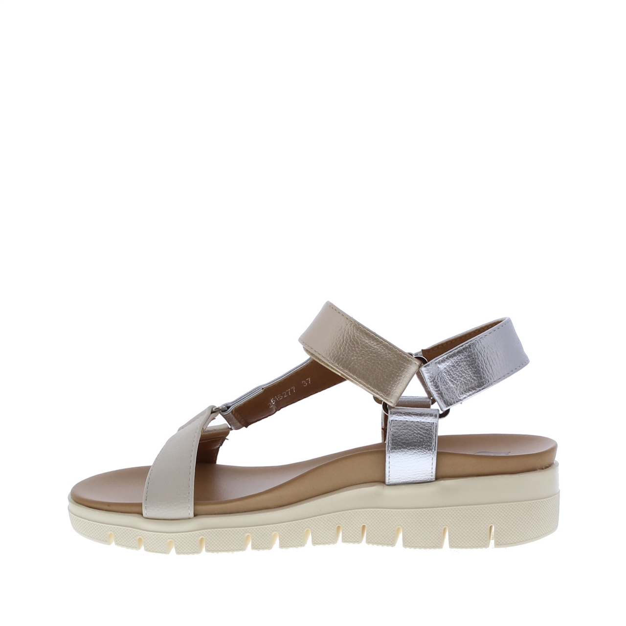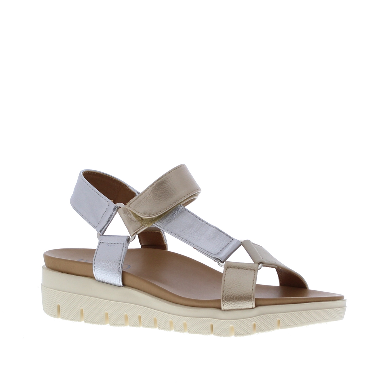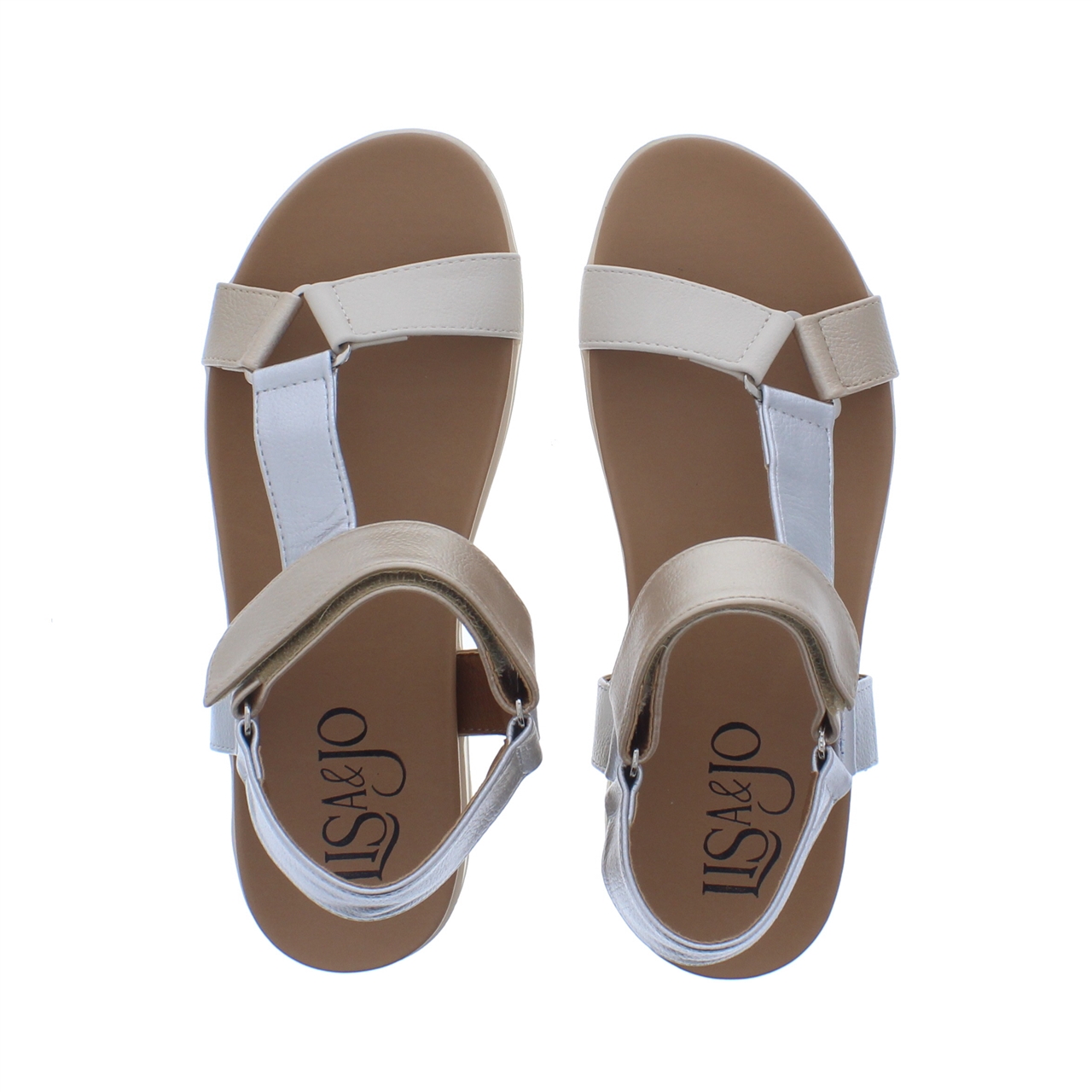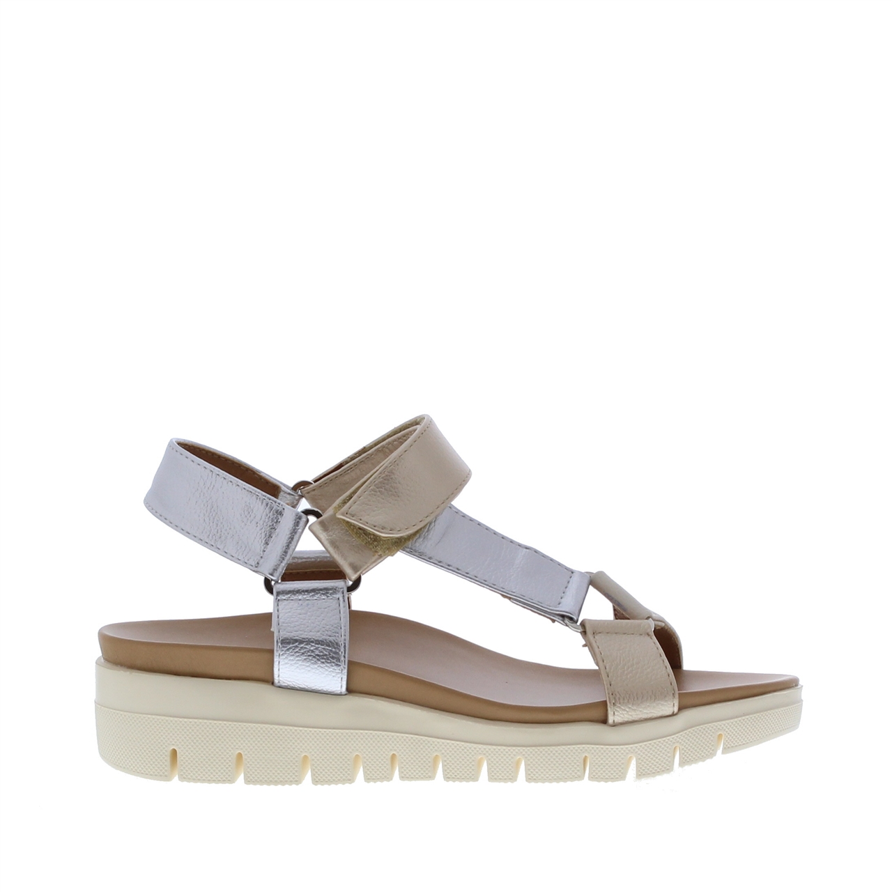 De Lisa&Jo Warin Sport Sandaal Metal Multi is een trendy en comfortabele sandaal met een klein sleehakje en een sportieve uitstraling. Dankzij de combinatie van gouden en zilveren accenten is deze sandaal perfect te combineren met verschillende outfits, van casual tot chic. De buitenkant is gemaakt van hoogwaardig imitatieleer, wat zorgt voor een stijlvolle look en een soepele pasvorm. De binnenkant is eveneens gevoerd met imitatieleer, wat extra draagcomfort biedt. De rubberen zool met een lichte sleehak zorgt voor stabiliteit en ondersteuning, ideaal voor langdurig gebruik. Dankzij de open leest en de klittenbandsluiting biedt deze sandaal een stevige pasvorm en eenvoudig instapgemak. De verstelbare bandjes zorgen ervoor dat de pasvorm perfect kan worden aangepast aan jouw voet.