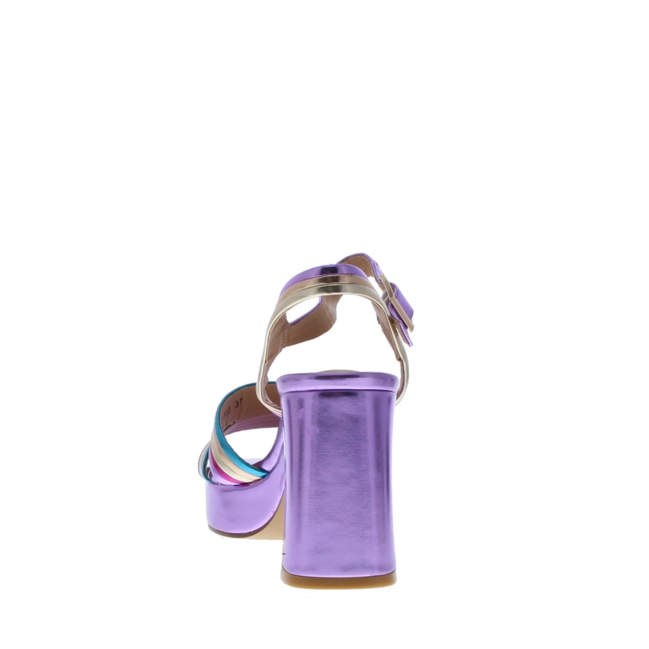 Dit model is vervaardigd uit imitatieleer en beschikt over een verstelbaar enkelbandje. De hak heeft een hoogte van 7 cm, met een plateauzool van 2 cm. Deze sandaal is verkrijgbaar in twee varianten: goud en multicolor. Combineer dit model met je favoriete jurk en geef je outfit een stralende finishing touch.
