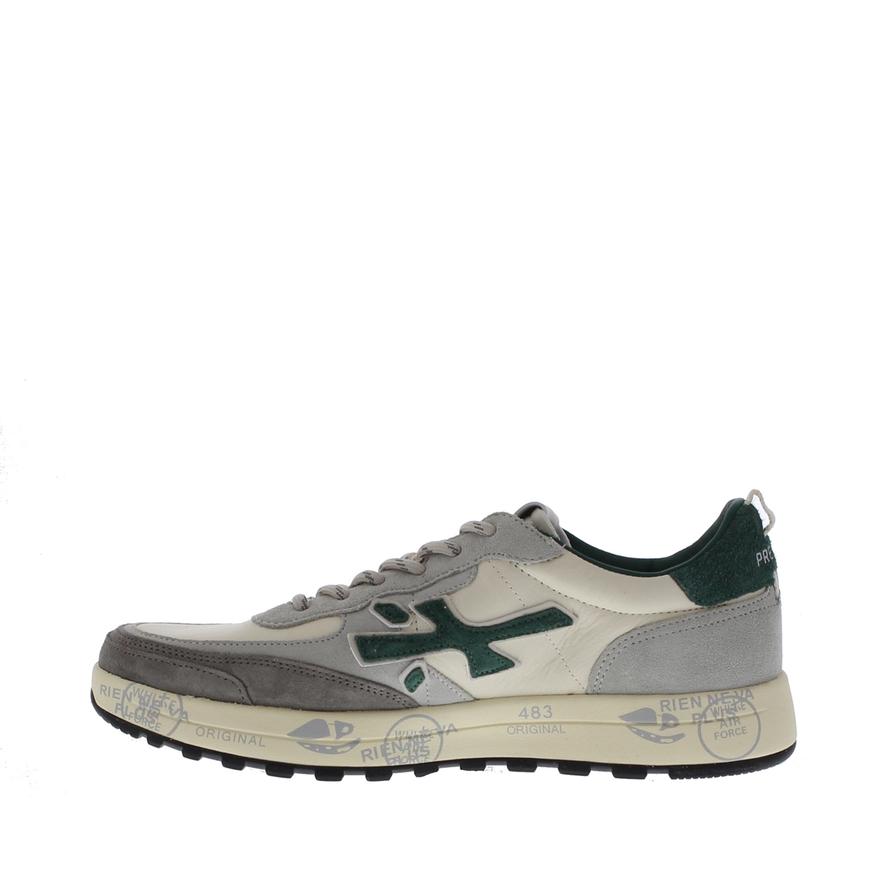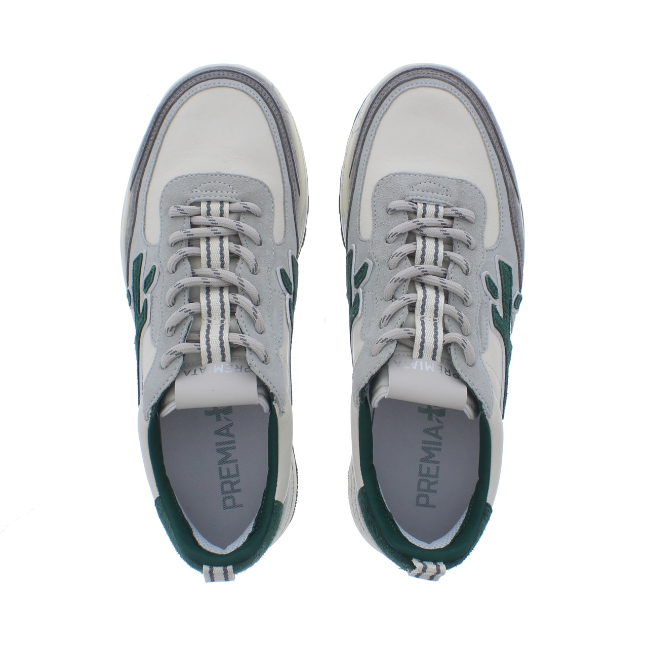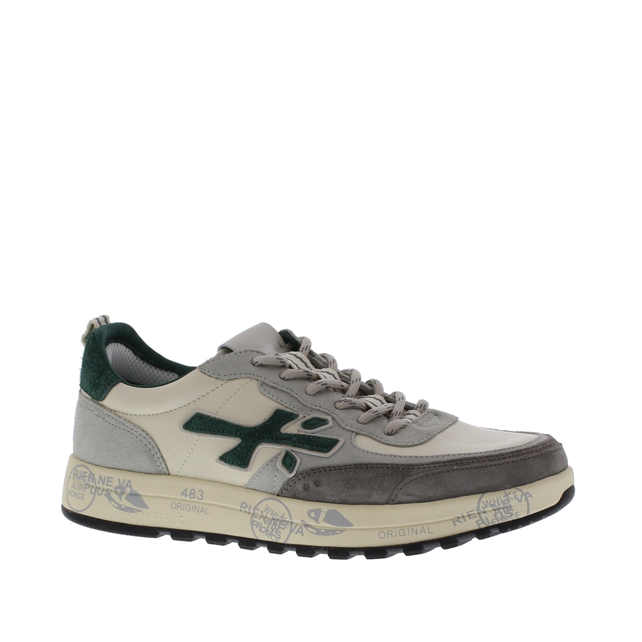 De Premiata Nous Heren Sneaker in wit met groene accenten is een verfijnde en veelzijdige sneaker die moeiteloos casual en verfijnd combineert. Het bovenwerk van premium wit leer en suède geeft de schoen een luxe uitstraling, terwijl de leren binnenvoering zorgt voor een licht en ademend gevoel. Dankzij het tijdloze ontwerp met ronde leest en klassieke vetersluiting is dit model een waardevolle aanvulling op je schoenenverzameling.