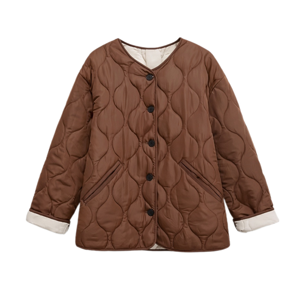 Het unieke quiltpatroon en de minimalistische afwerking geven dit jasje een moderne, Scandinavische look.