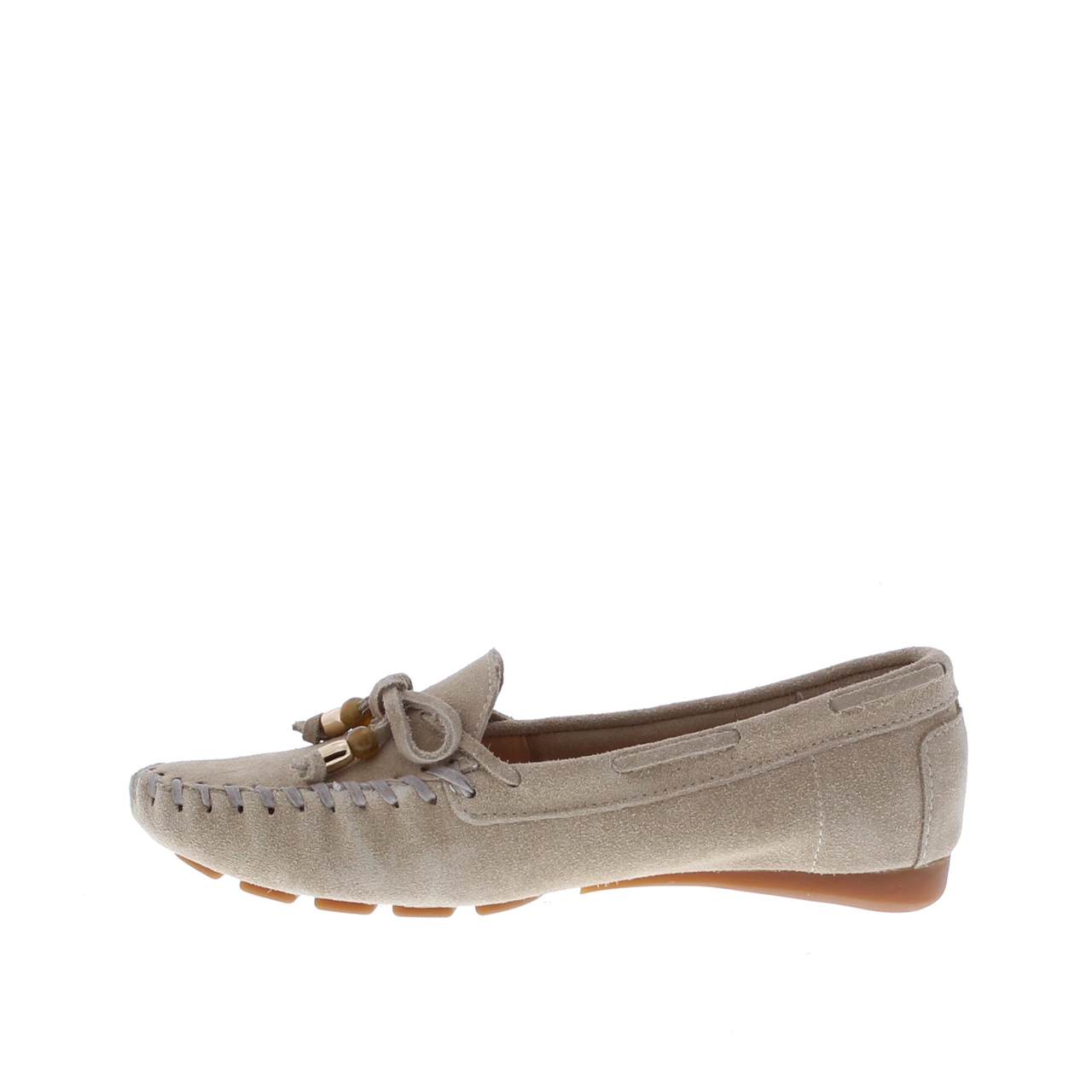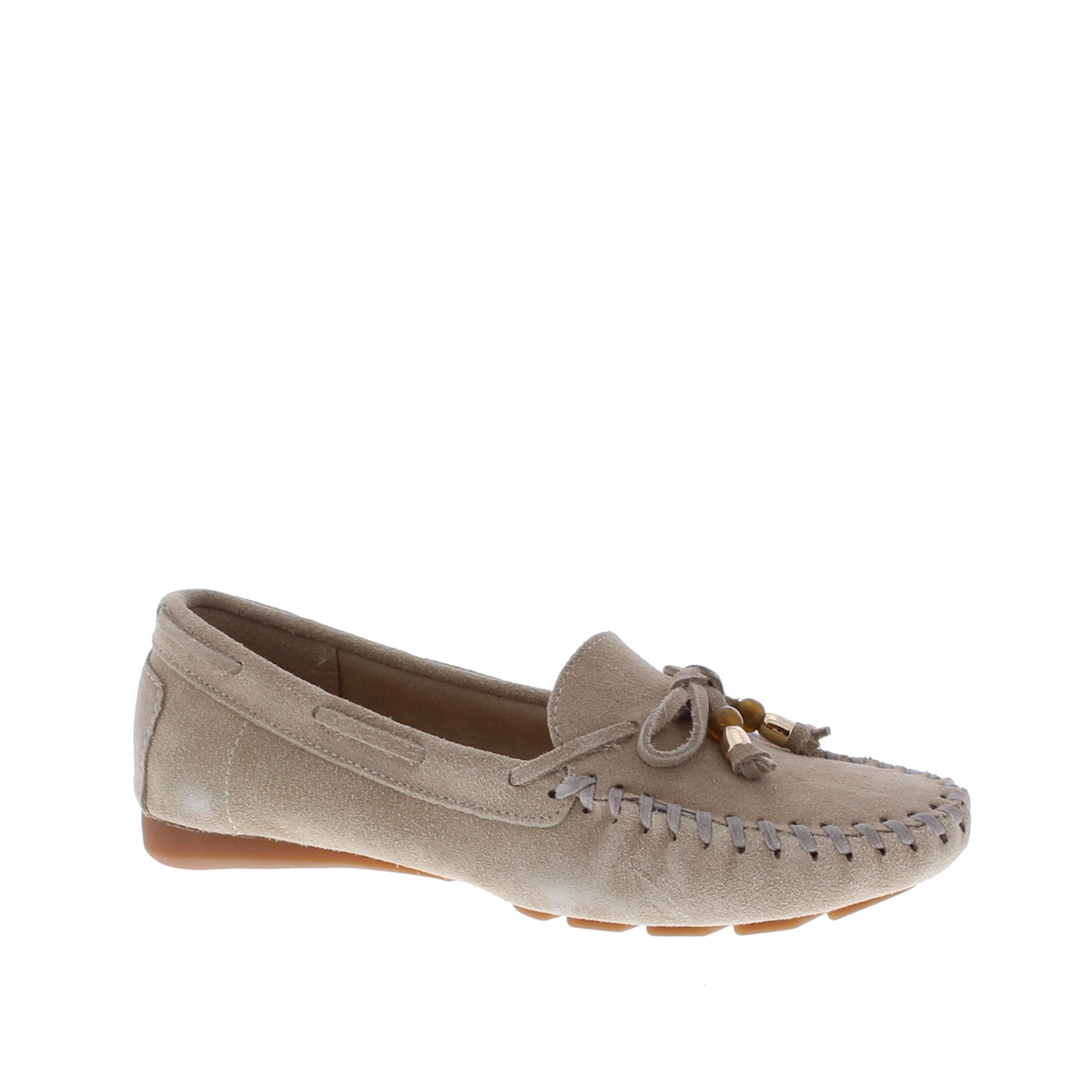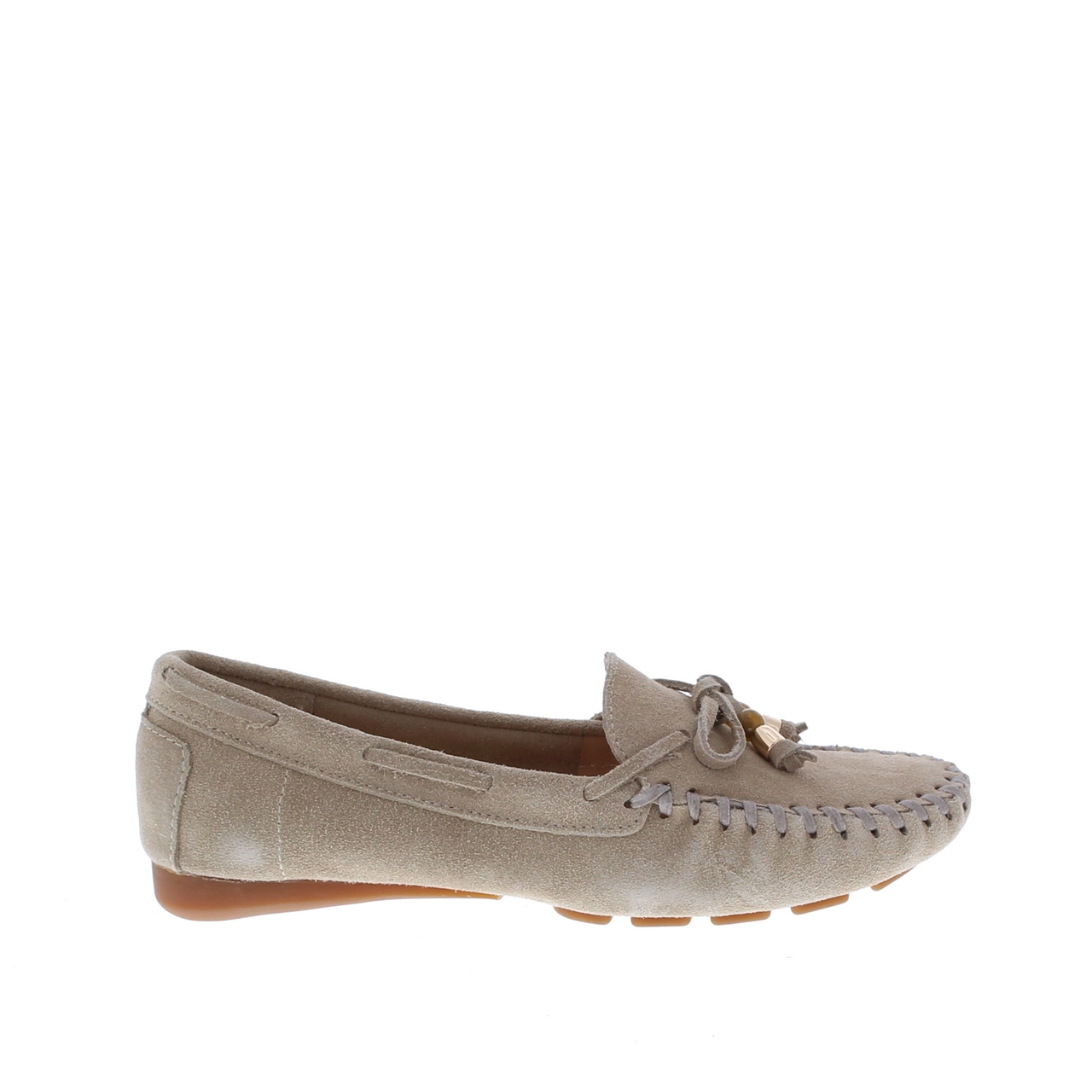 Binnenin is de mocassin afgewerkt met leer, waardoor het geheel mooi aanvoelt. De rubberen zool zorgt voor een nuchtere, praktische basis en maakt de schoen geschikt om vaak te dragen. Je kiest uit de kleuren beige of taupe; beide tinten laten zich moeiteloos combineren en passen mooi bij het voorjaar en de zomer, maar ook bij zachte, neutrale looks in het najaar.