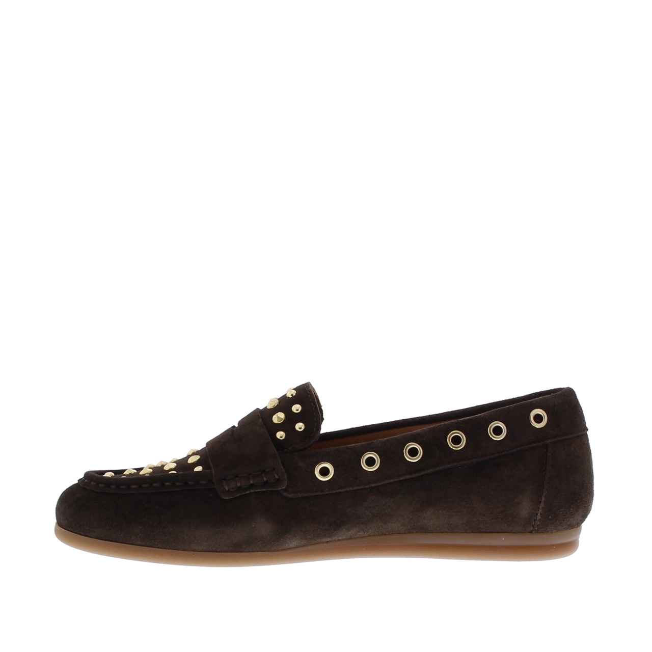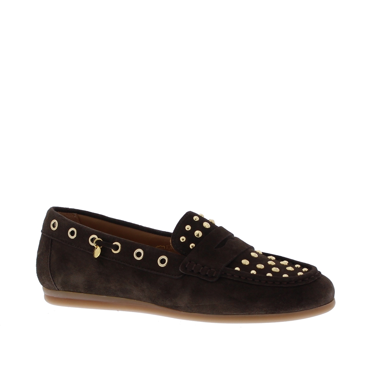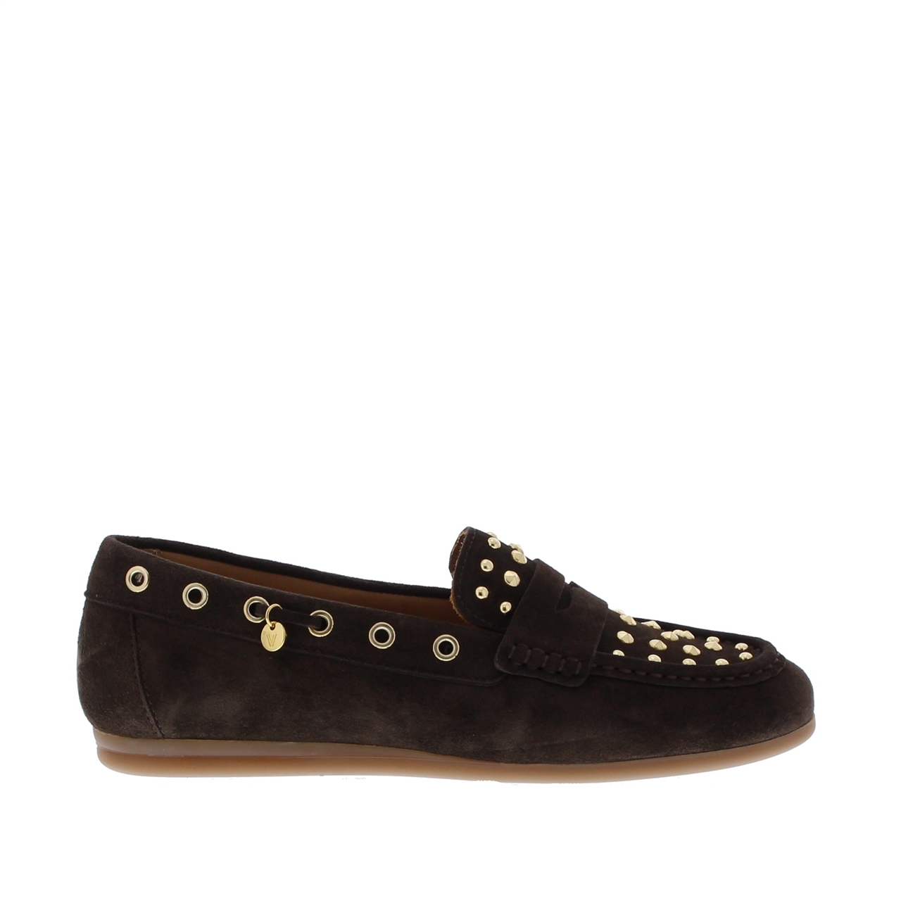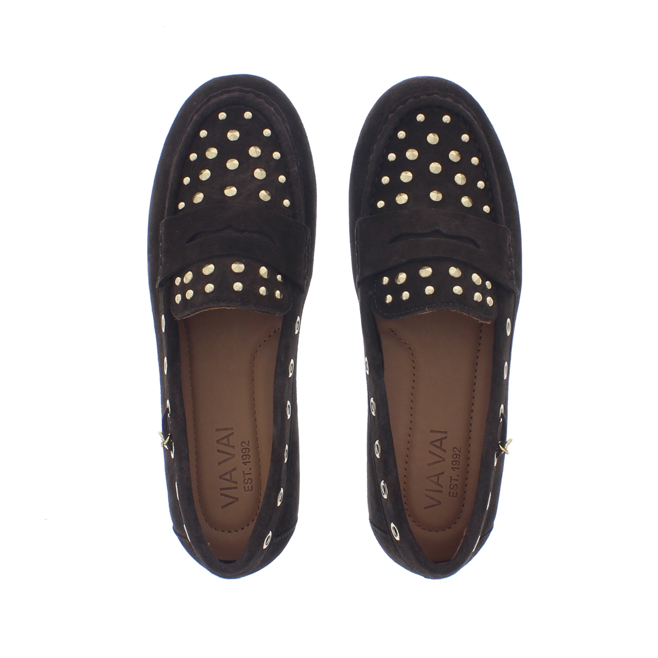 Deze instapper is uitgevoerd met een zachte, matte look die doet denken aan suède, en is afgewerkt met goudkleurige ringetjes langs de zijkant. Op de wreef en bij de neus zorgen gouden studs voor een subtiel statement, terwijl het kleine VIA VAI-hangertje het geheel verfijnd afmaakt.