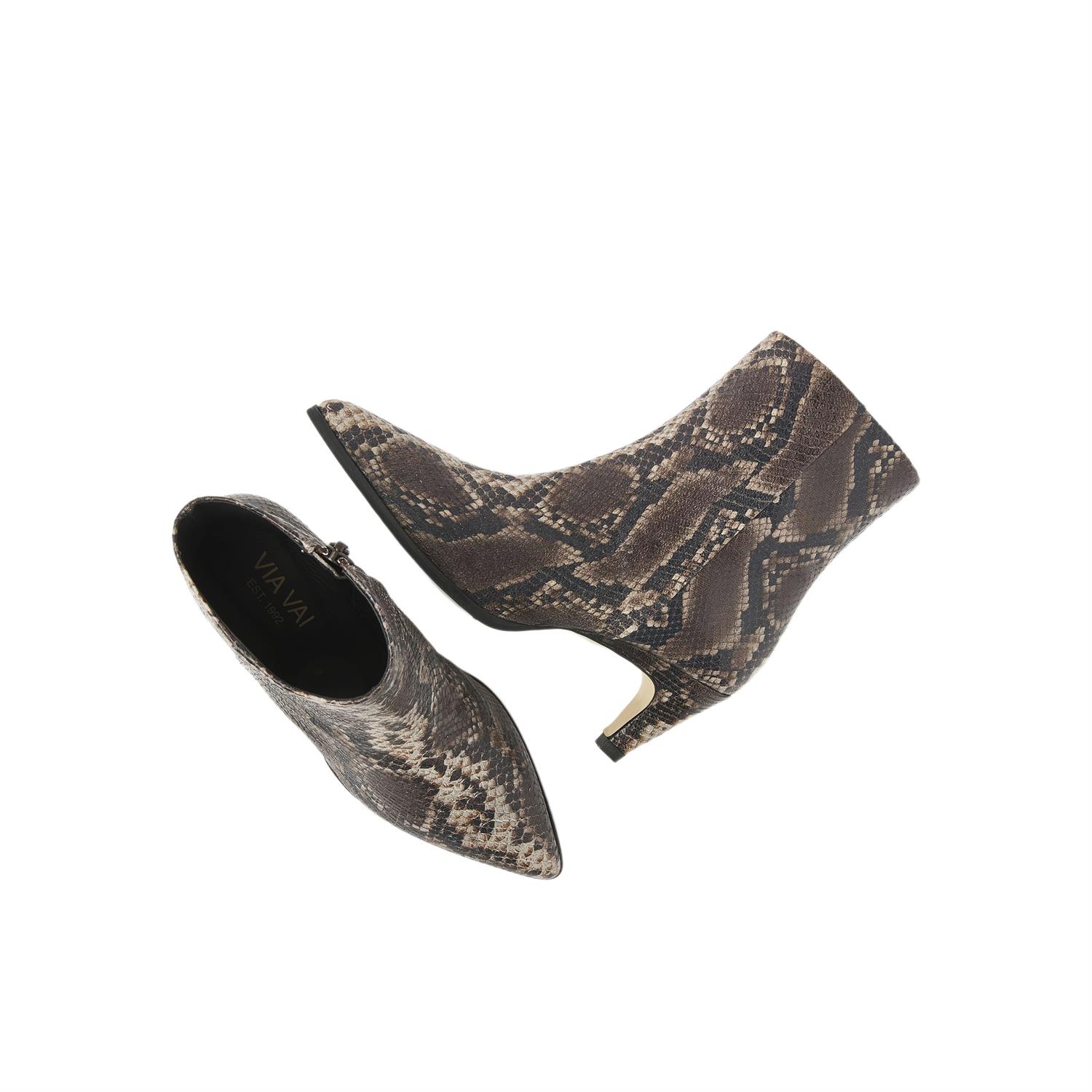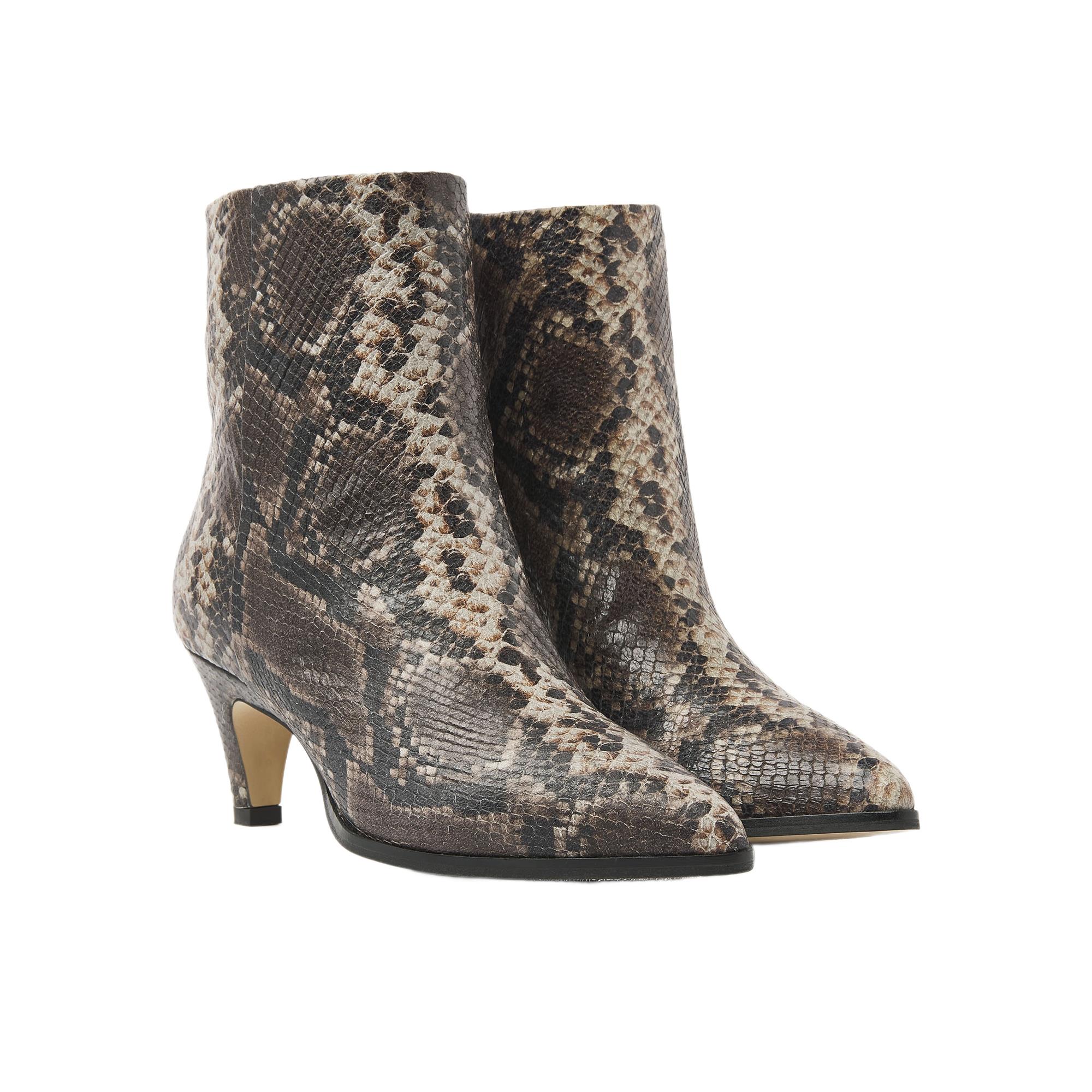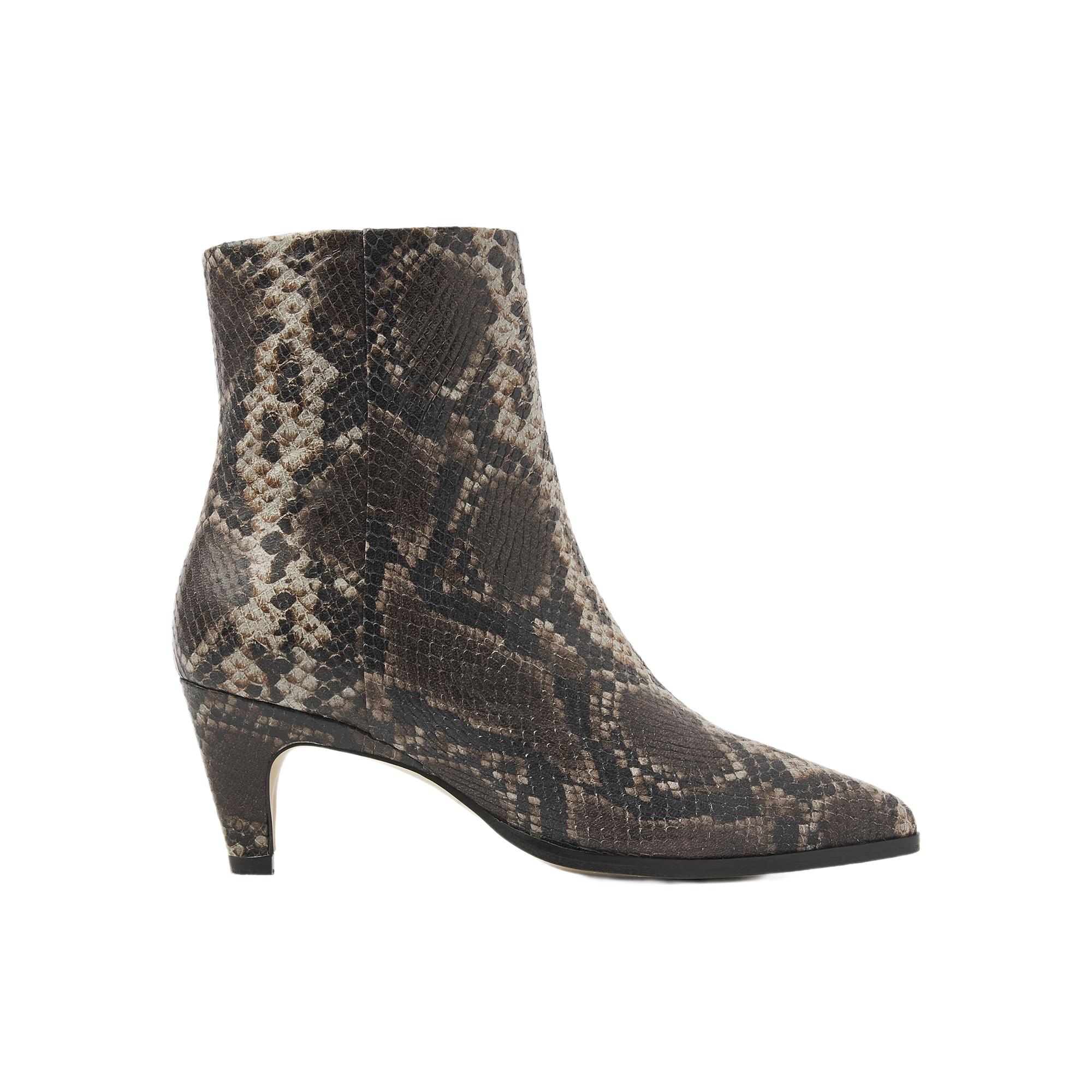 Deze enkellaars komt in een warme bruine tint met een opvallende slangenprint, waardoor je look in één keer meer karakter krijgt. De elegante hak tot 5 cm zorgt voor een vrouwelijke lijn zonder dat het geheel zwaar aanvoelt, en de smalle, verfijnde neus maakt het silhouet extra chic.