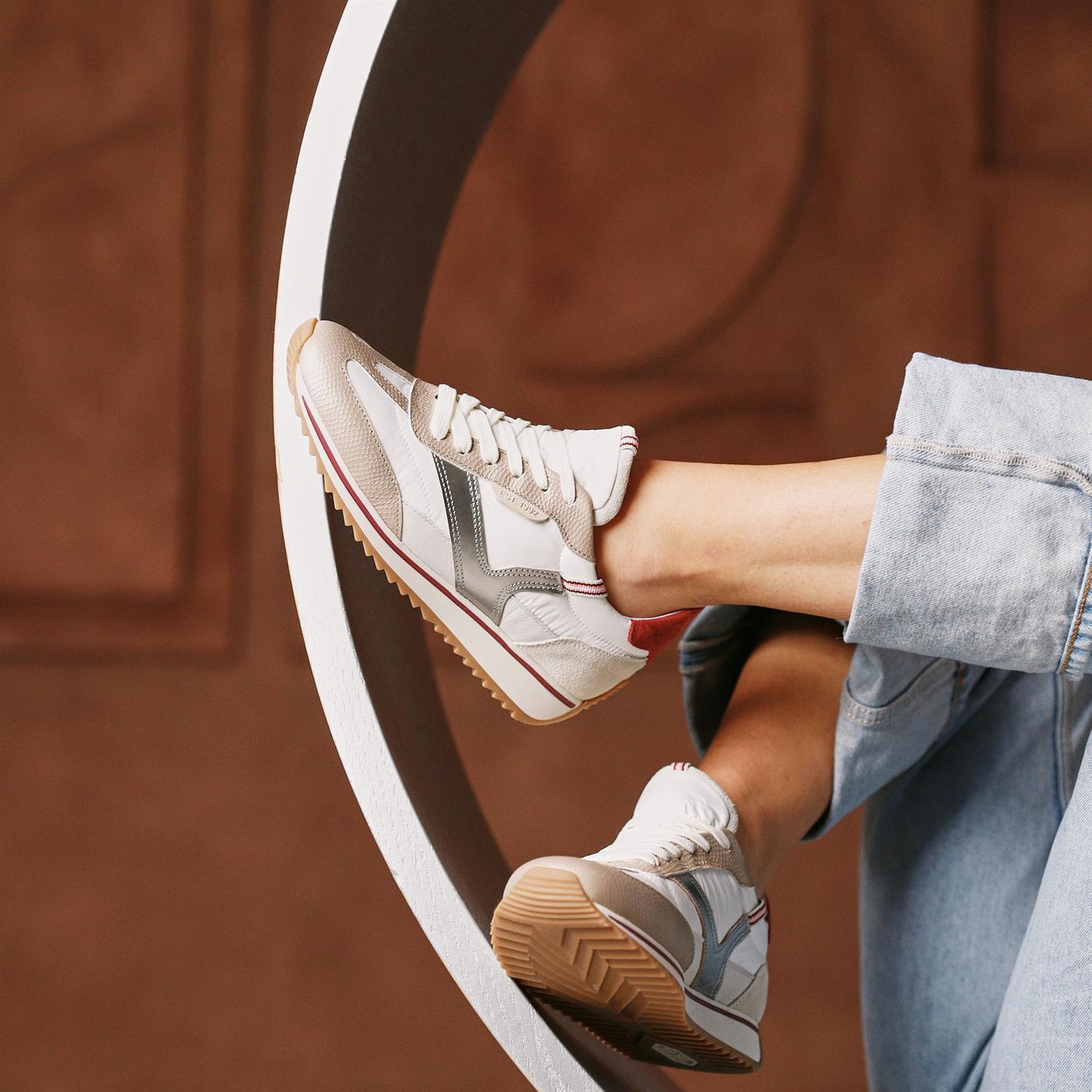 De Mikki Ruby is verkrijgbaar in groen, wit en zilver en speelt met een opvallende mix van materialen aan de buitenkant. Die combinatie geeft het ontwerp een gelaagde look, met subtiele contrasten die je outfit net wat meer karakter geven. De ronde leest houdt het silhouet mooi in balans, waardoor de sneaker elegant én makkelijk te combineren blijft.
