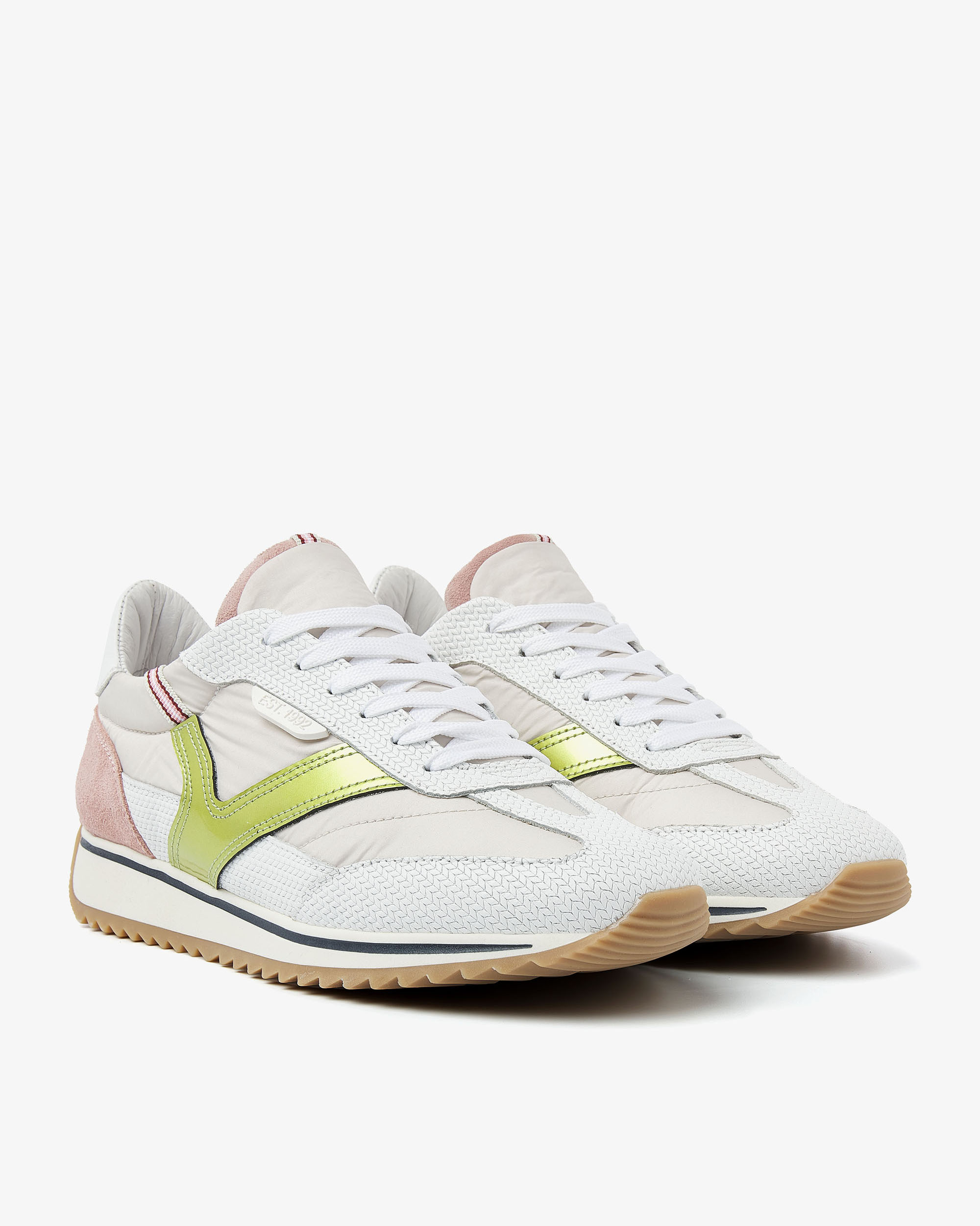 De Mikki Ruby is verkrijgbaar in groen, wit en zilver en speelt met een opvallende mix van materialen aan de buitenkant. Die combinatie geeft het ontwerp een gelaagde look, met subtiele contrasten die je outfit net wat meer karakter geven. De ronde leest houdt het silhouet mooi in balans, waardoor de sneaker elegant én makkelijk te combineren blijft.