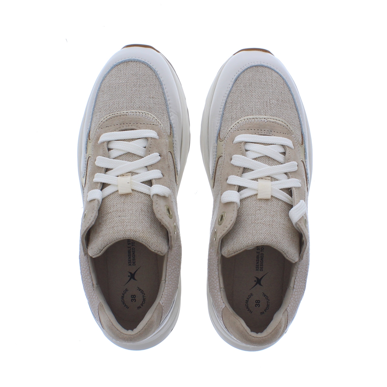 Het bovenwerk is uitgevoerd in een combinatie van materialen met subtiele structuur- en kleurnuances, waardoor de sneaker net wat meer diepte krijgt dan een effen model. Binnenin is de schoen afgewerkt met leren voering, wat prettig aanvoelt en mooi past bij het premium karakter van Xsensible.